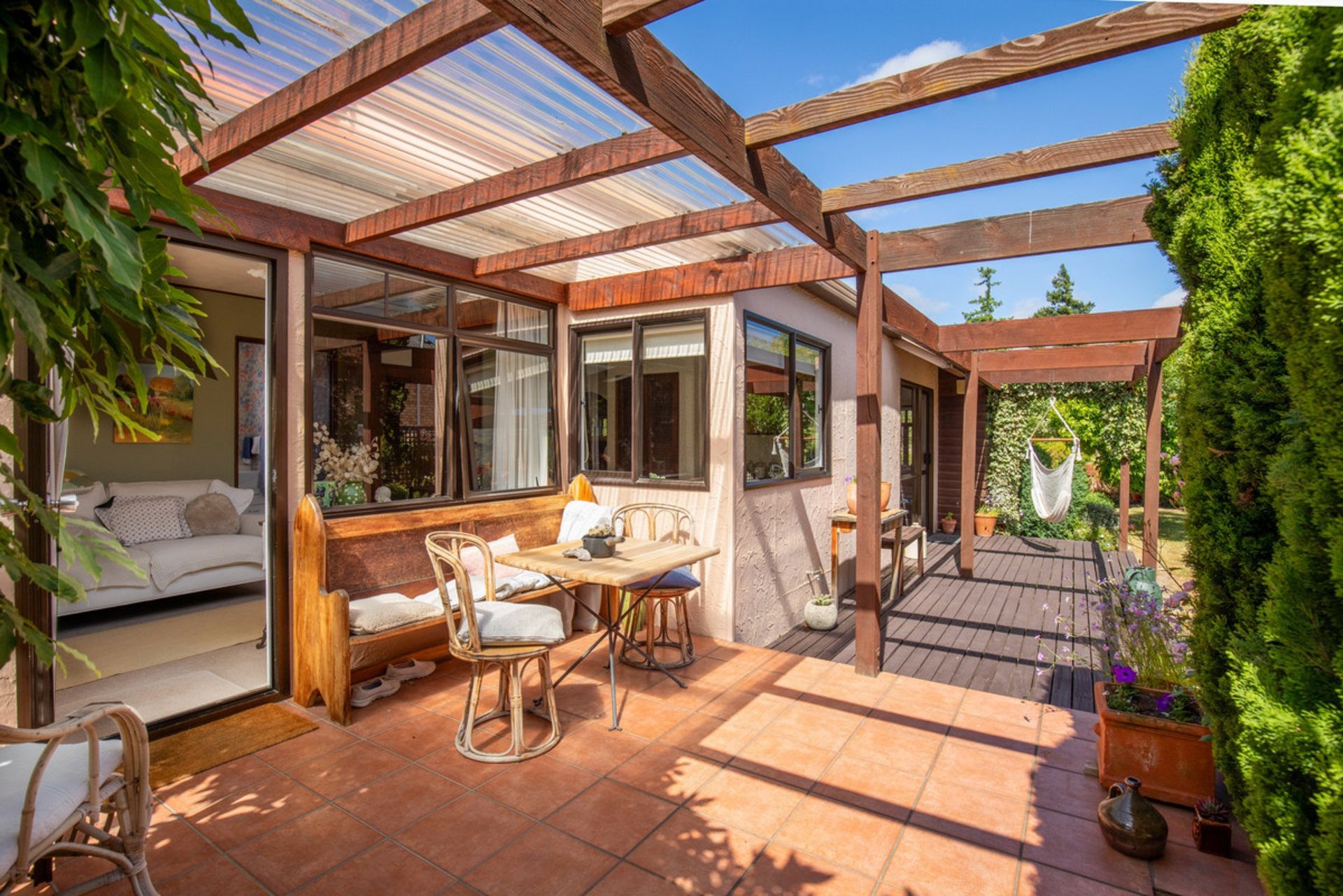 Sit back and relax in the spacious open plan lounge/dining area. Heating well catered for with a choice of woodburner or heat pump. The central kitchen area flows to another sitting room that connects to the outdoor patio, a beautiful spot to sit and soak up the sun, along with two bedrooms and the main bathroom. The master wing has its own bathroom, bedroom with heat pump and laundry area. Outside you will also find a large separate single garage, garden shed and raised vege gardens.