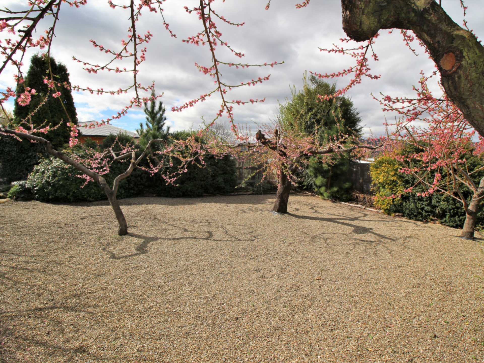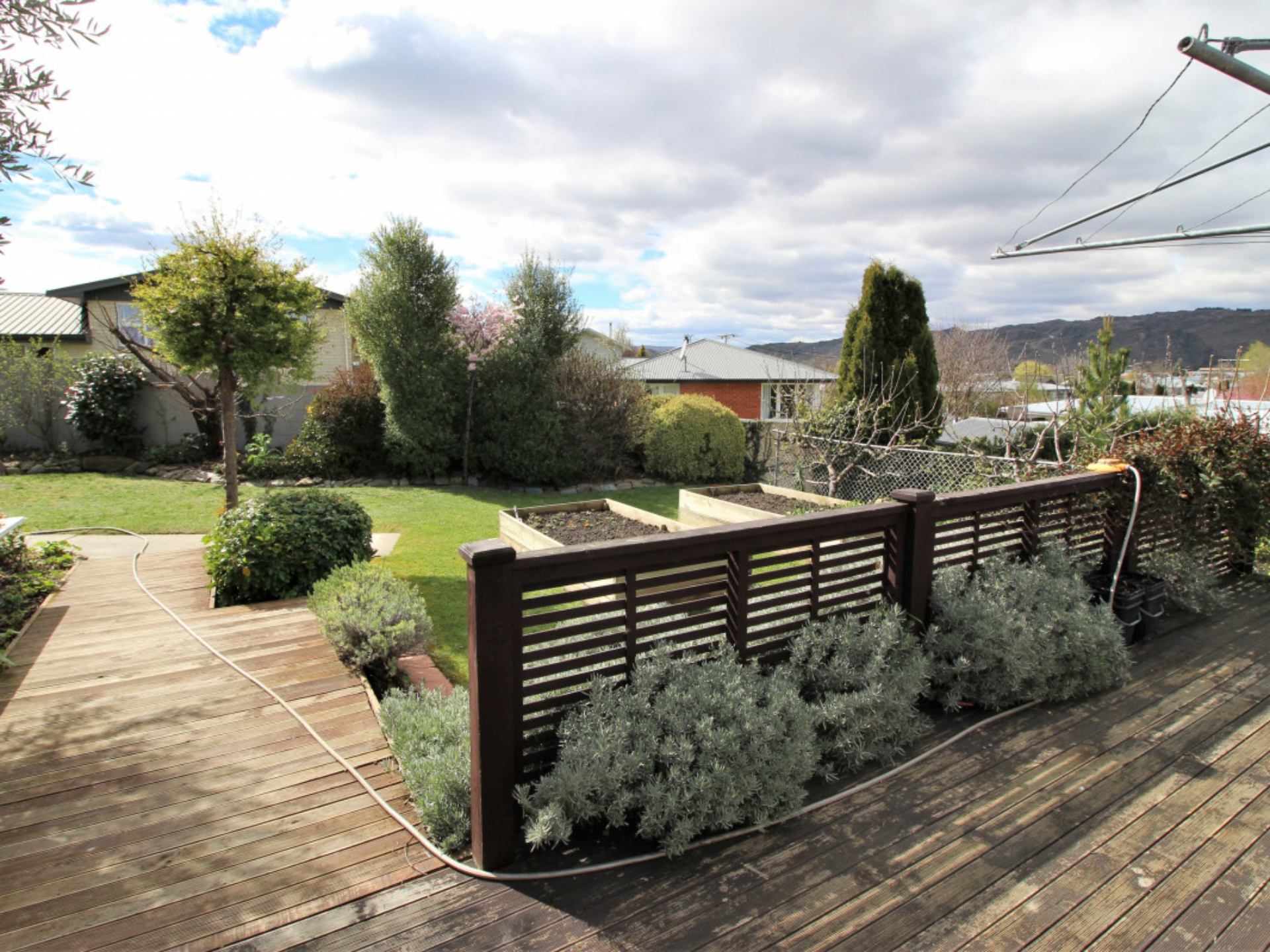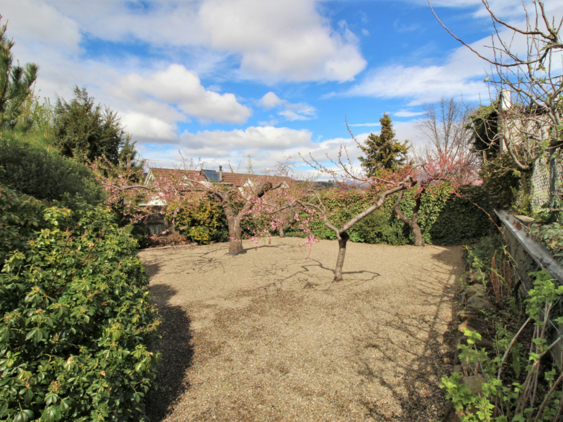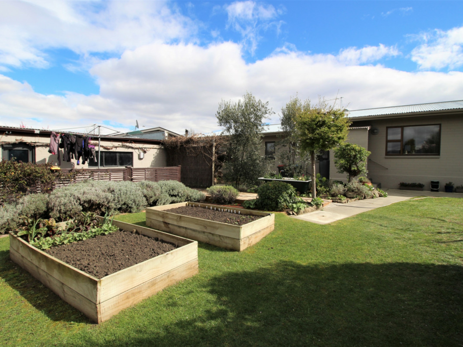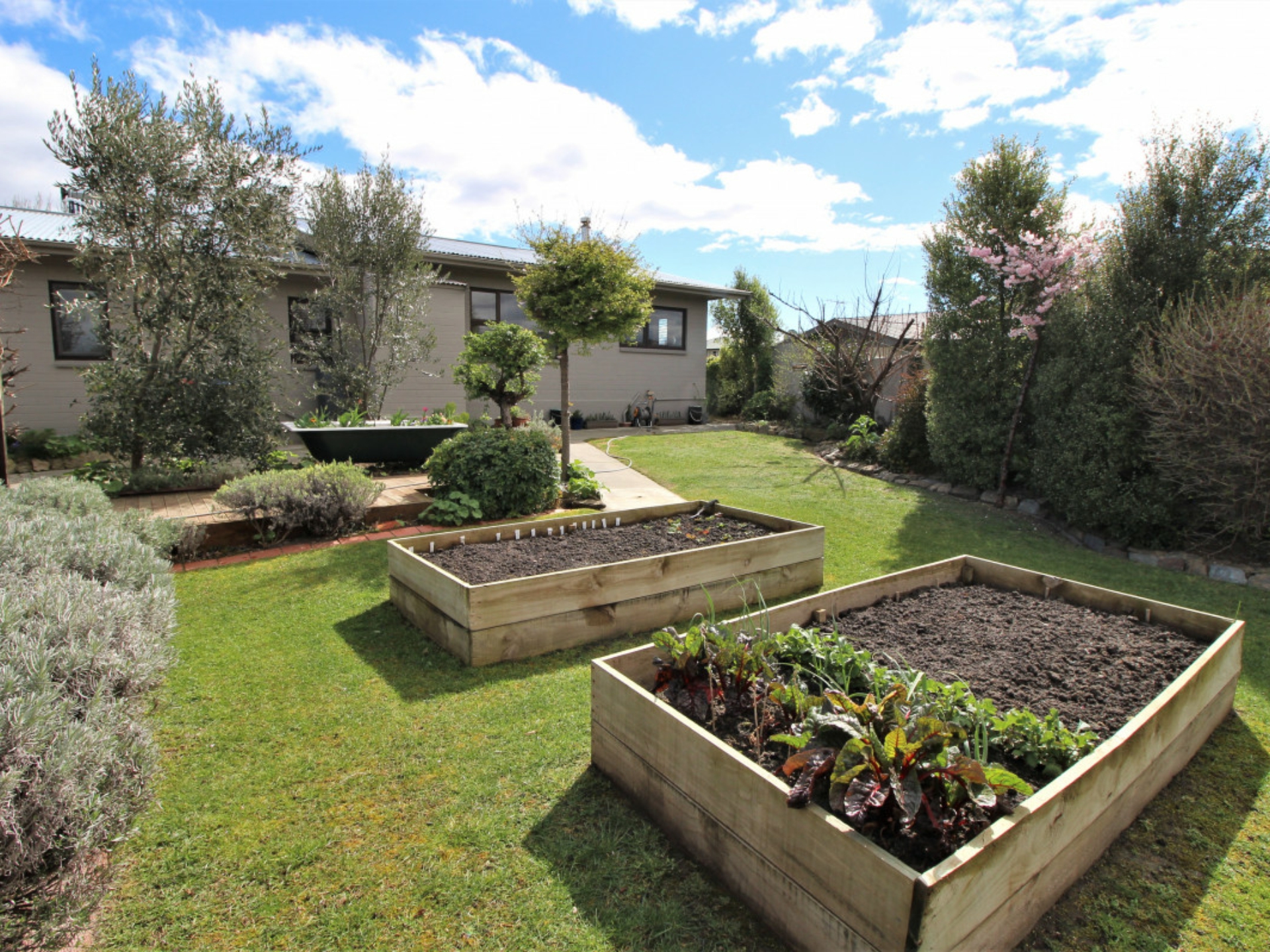 Raised vegetable beds and an assortment of fruit trees on the lower Schisted level all make for easy care grounds.