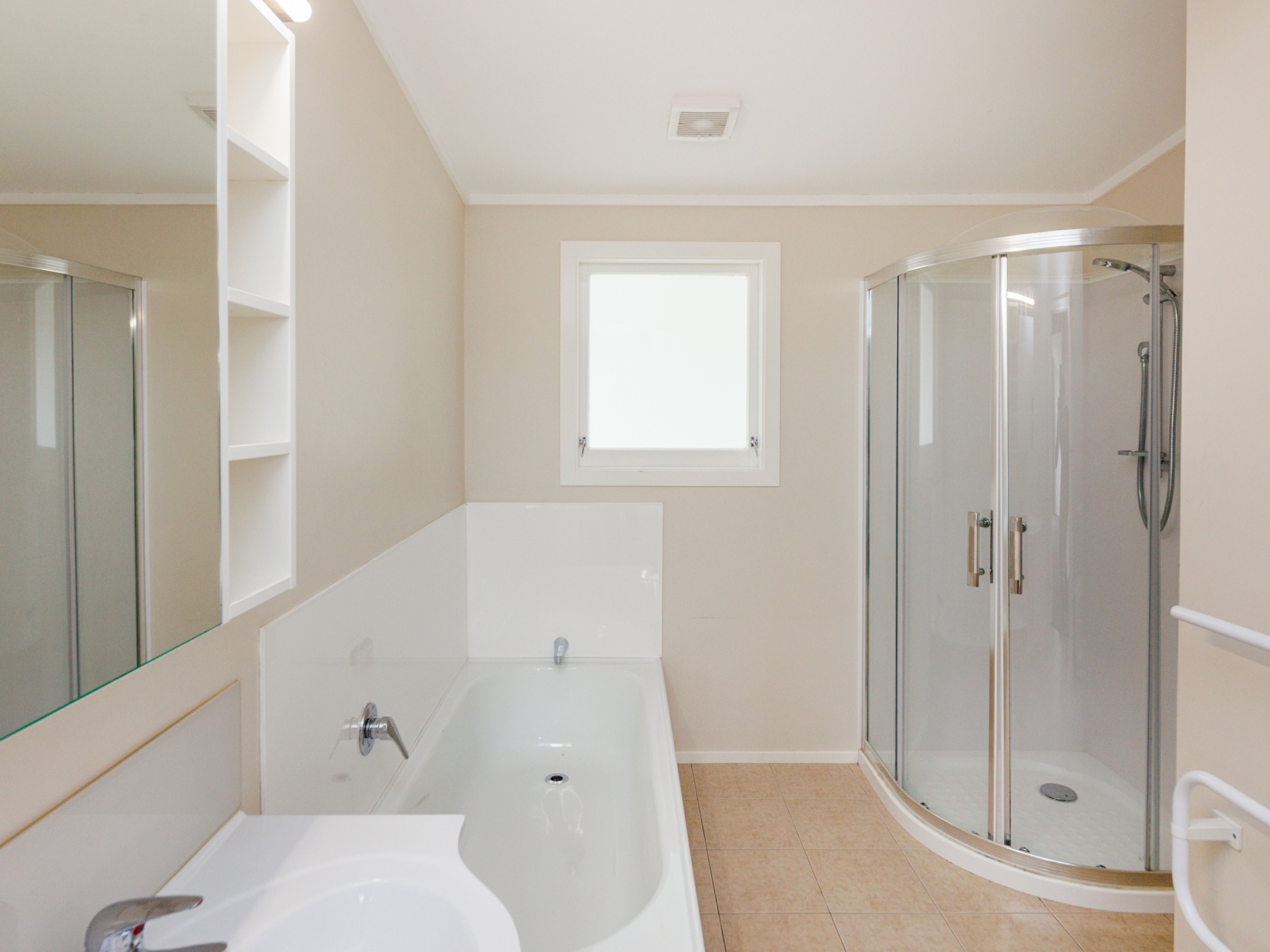 •Large family bathroom boasts a shower, bath, vanity and toilet.