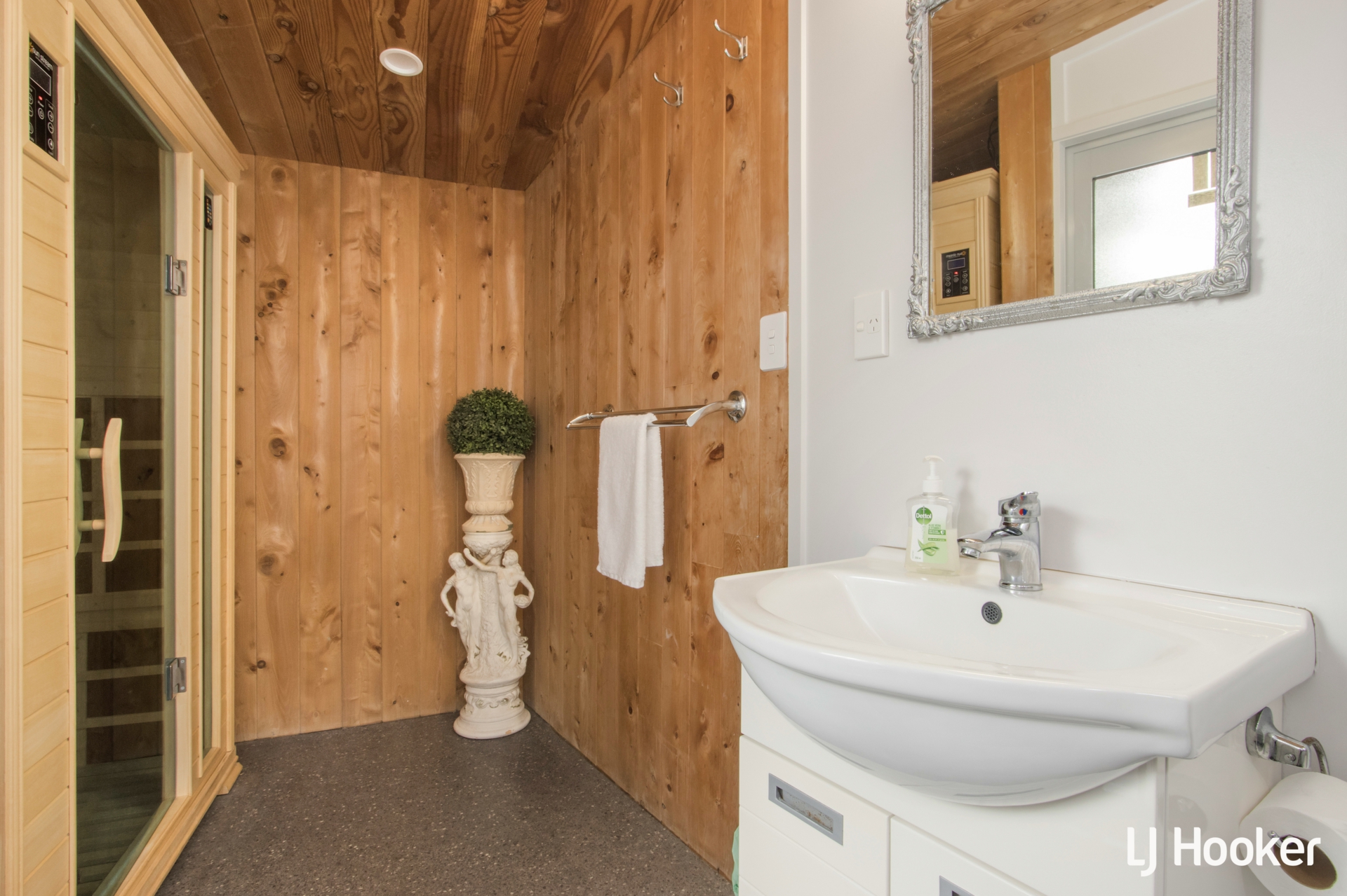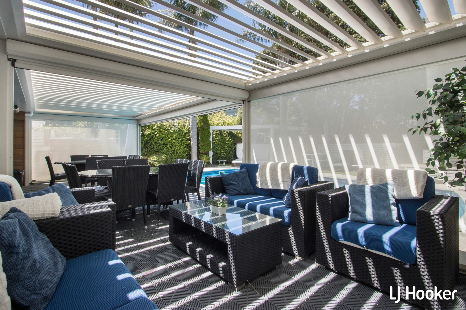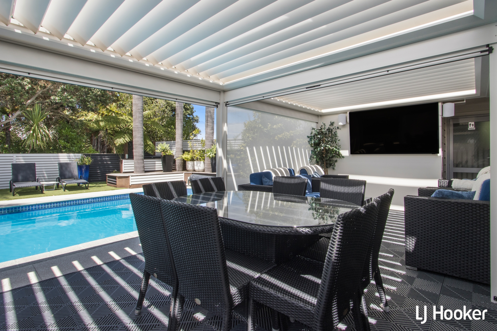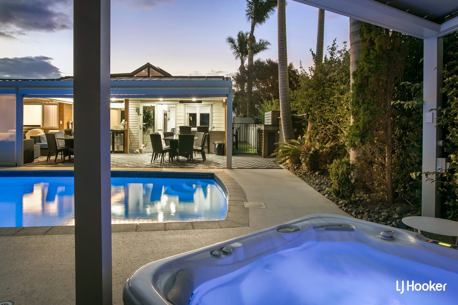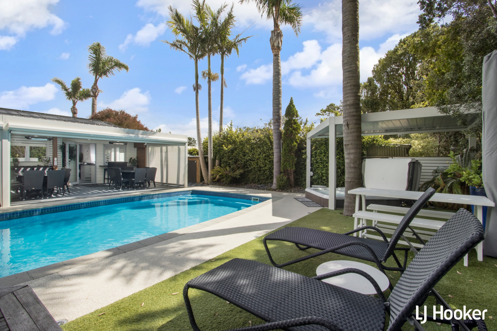 At the heart of the property, resort-style amenities elevate it well beyond a traditional coastal home. A dedicated pool house incorporates a heated swimming pool, spa and infrared sauna, supported by indoor-outdoor entertaining areas, lounge facilities and seating designed to comfortably host large groups