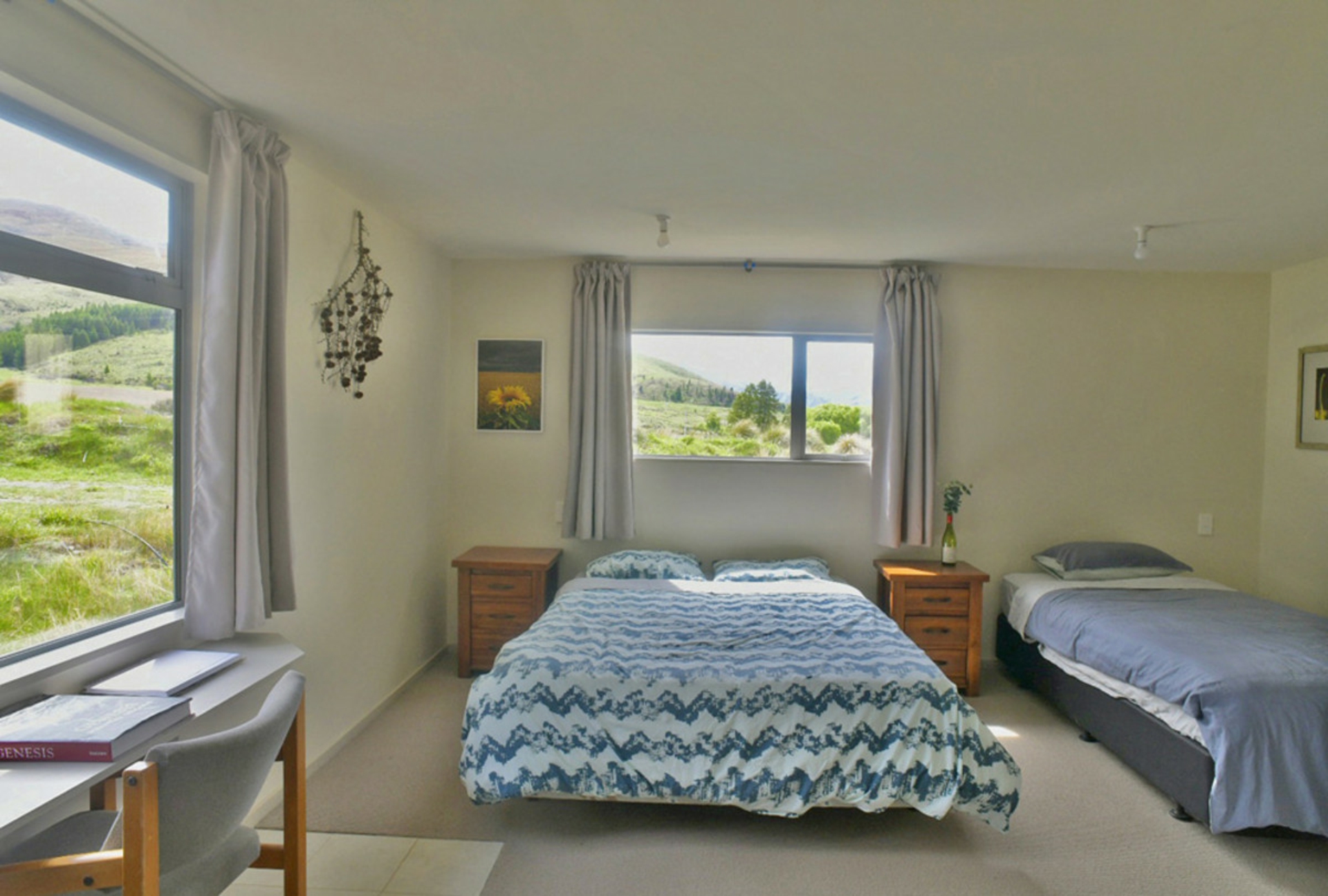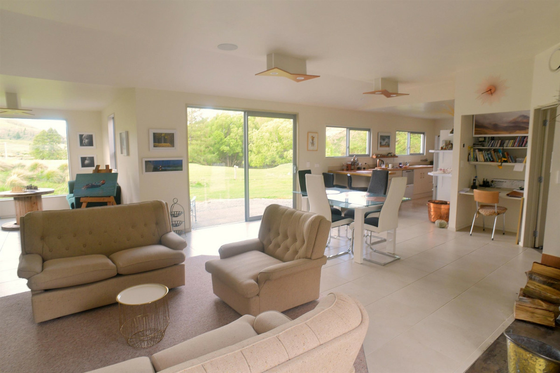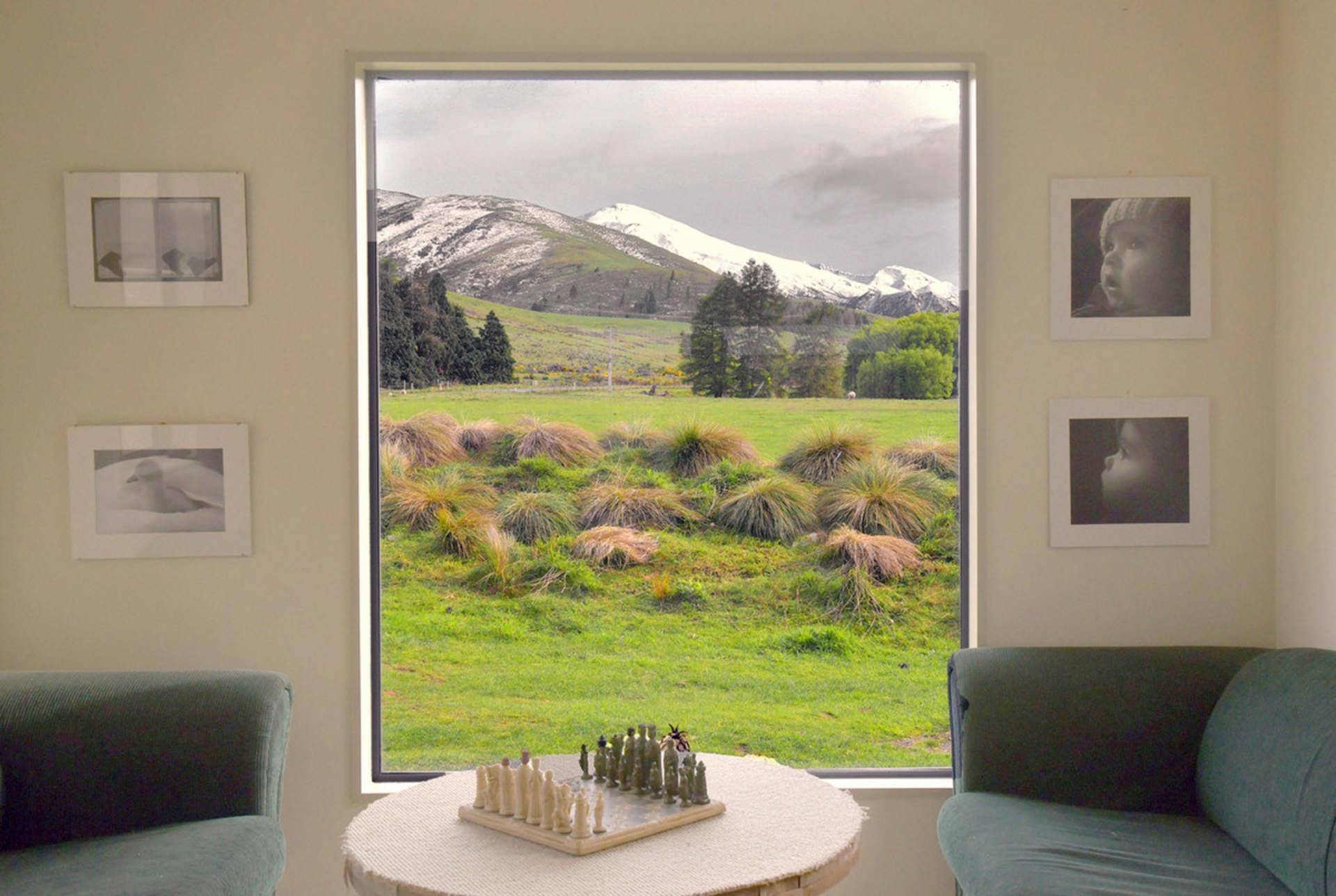 A reading nook off the lounge provides a quiet space to enjoy the views to the snow capped mountains across the rural land in front.