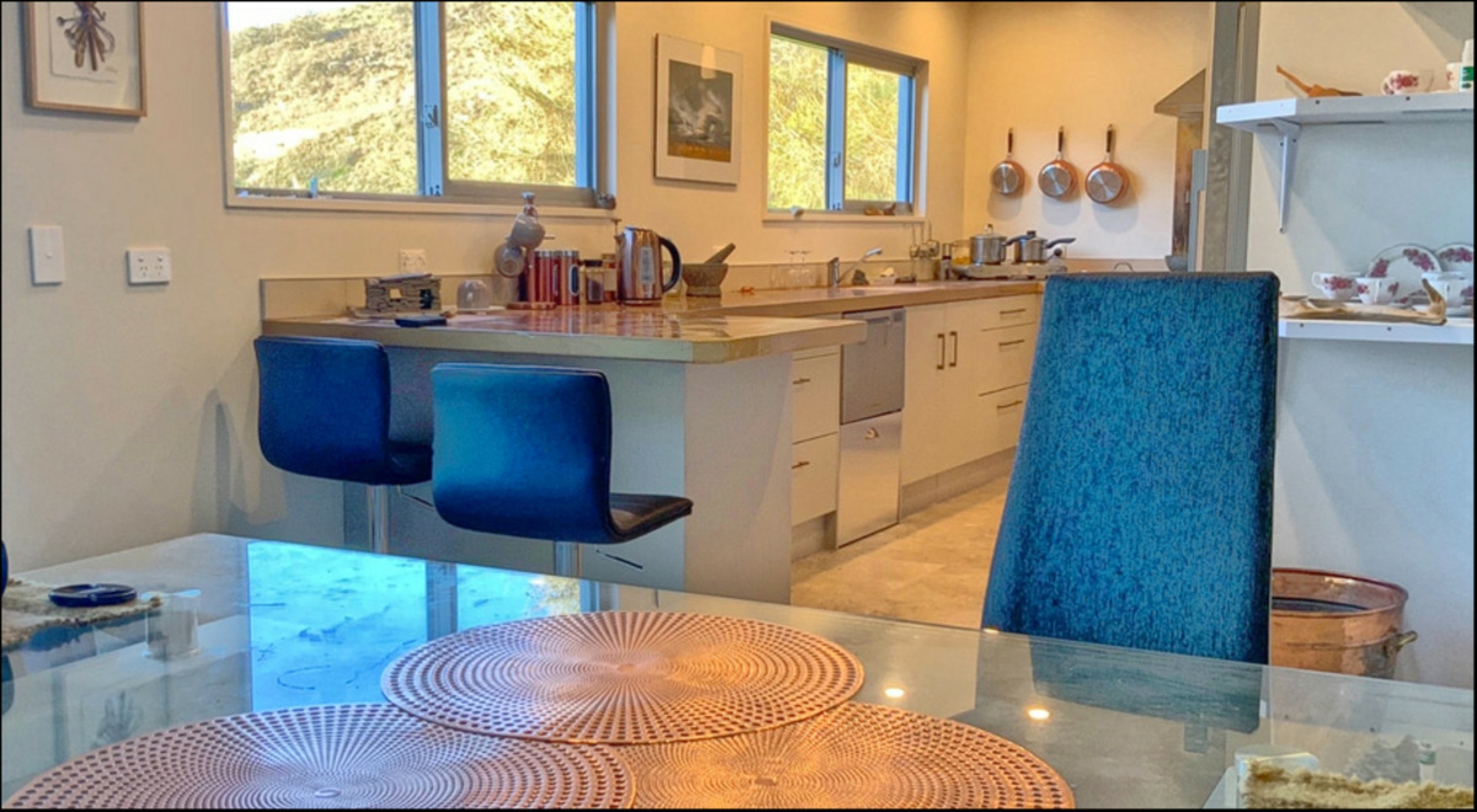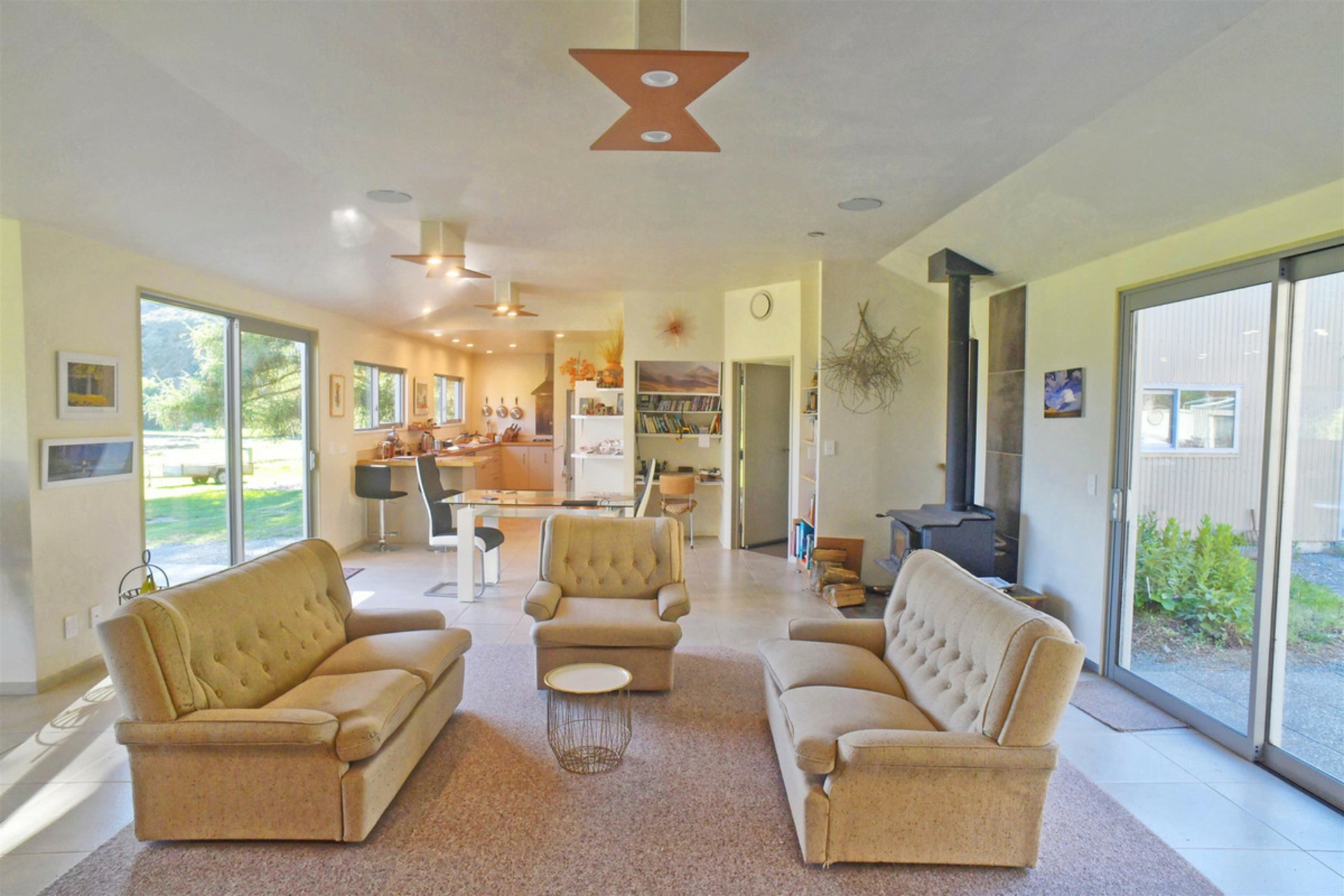 Built in 2019, the home is double glazed throughout with open plan living opening to a sheltered courtyard, a small pond and subtle gardens. The spacious kitchen includes a gas hob, wall oven, dishdrawer, pantry storage and plumbing to the fridge/freezer It has a Tarras log burner with wetback for heating.