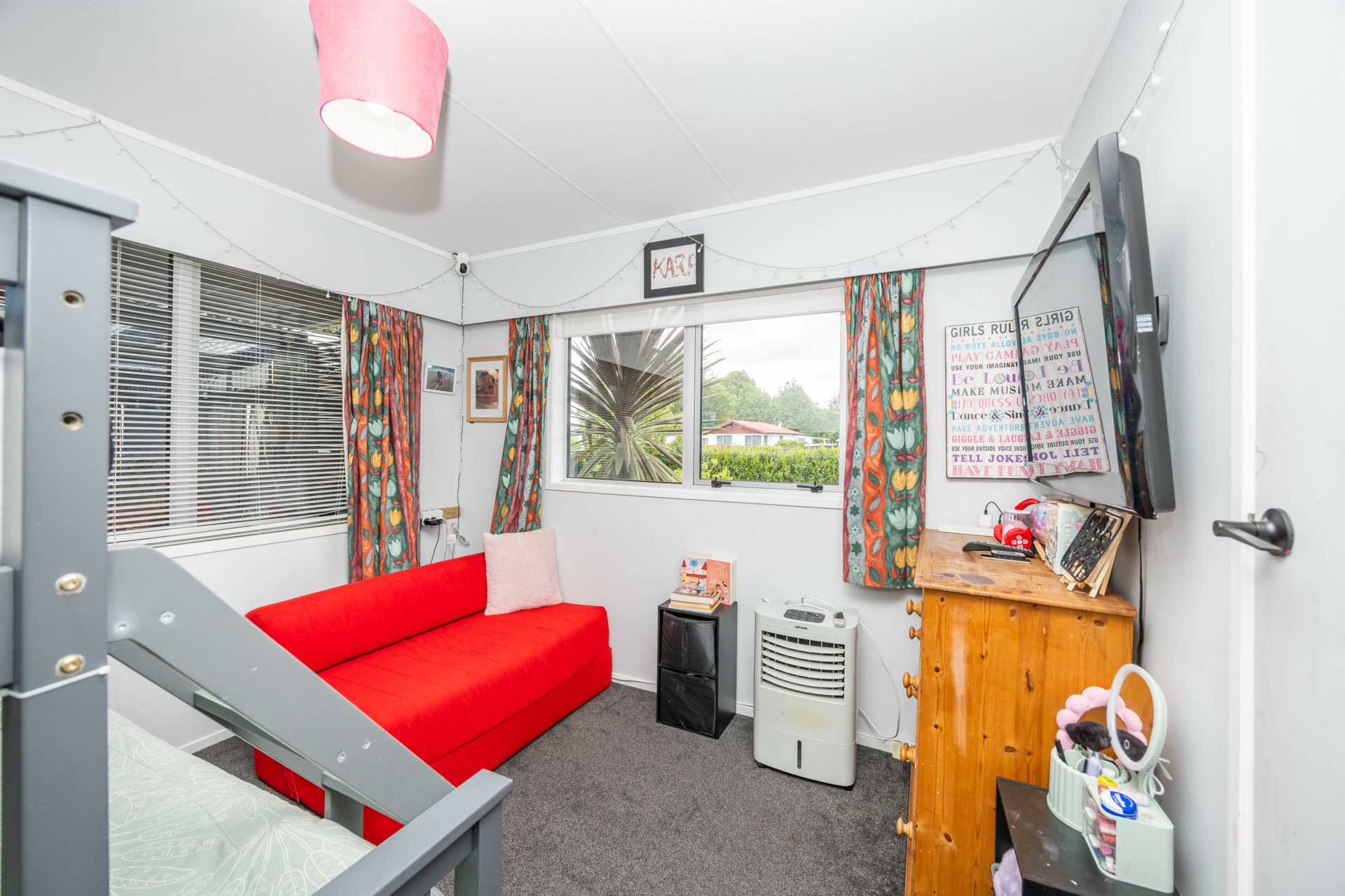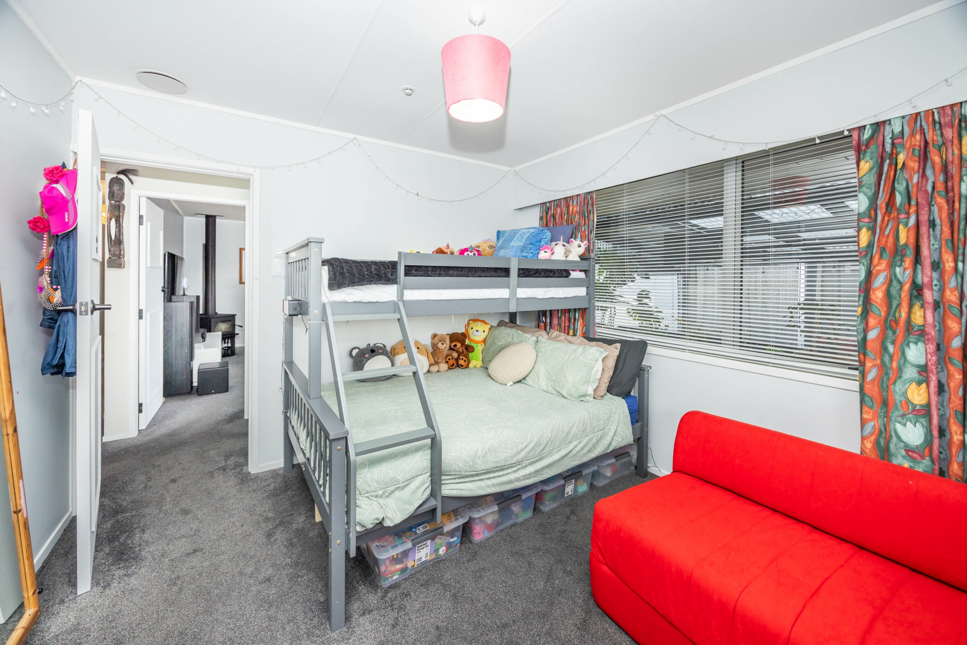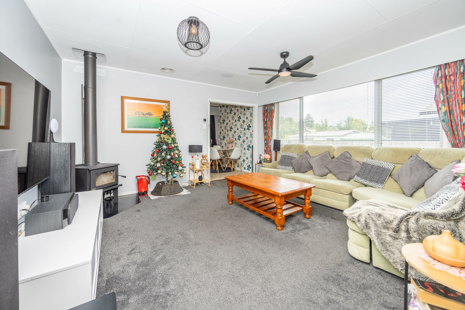 This well-presented three-bedroom, one-bathroom family home is packed with features and comfort. Enjoy year-round climate control with an HRV system with heat transfer, Heat pumps, a wood-burning fireplace, ceiling fans, and double glazing throughout.