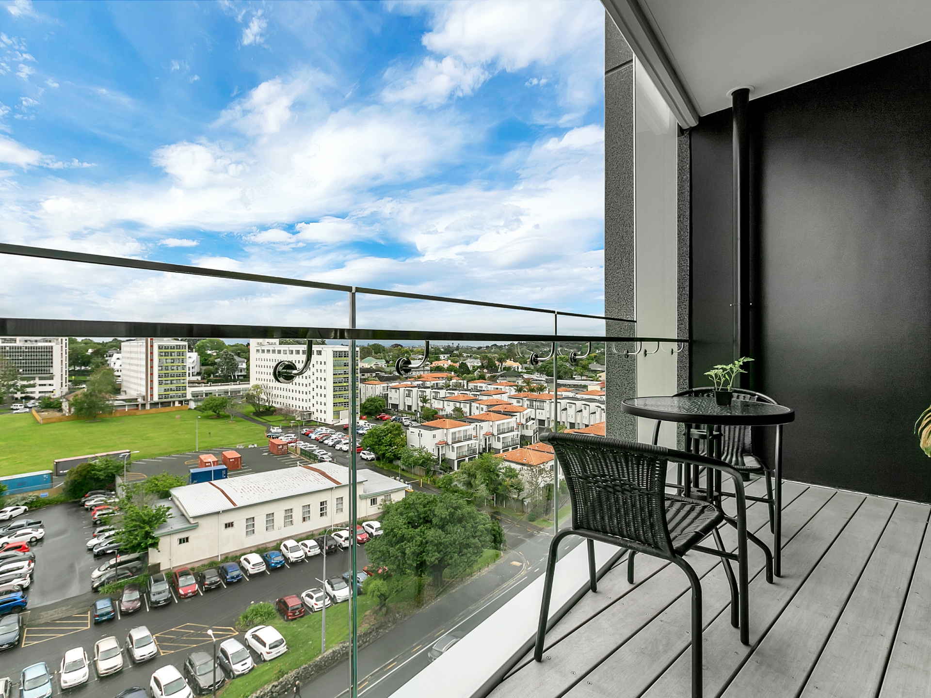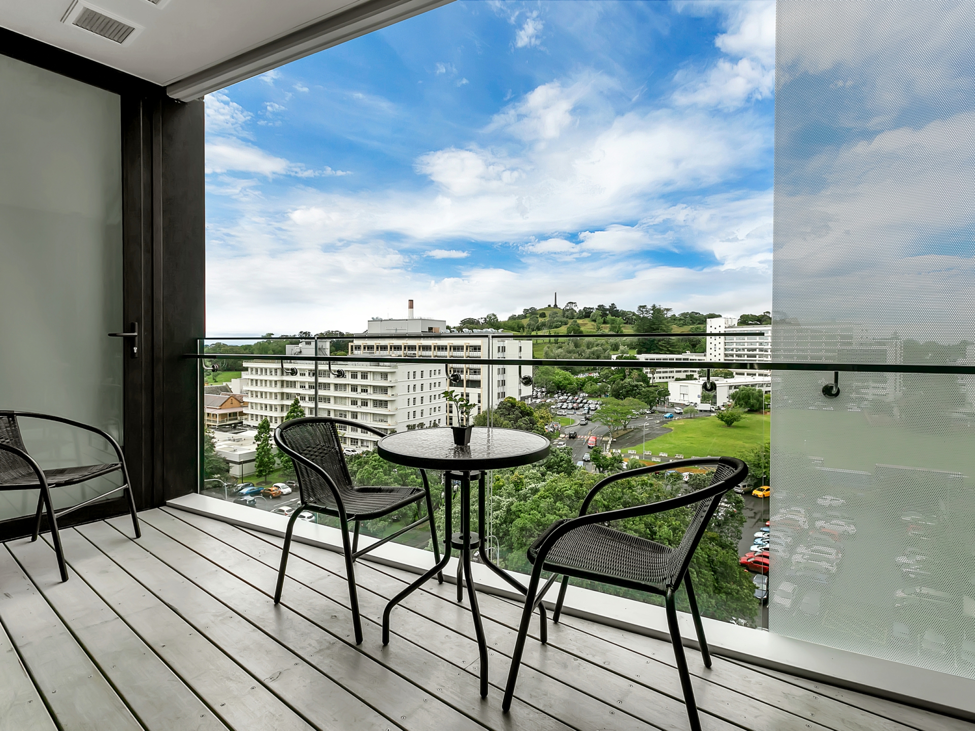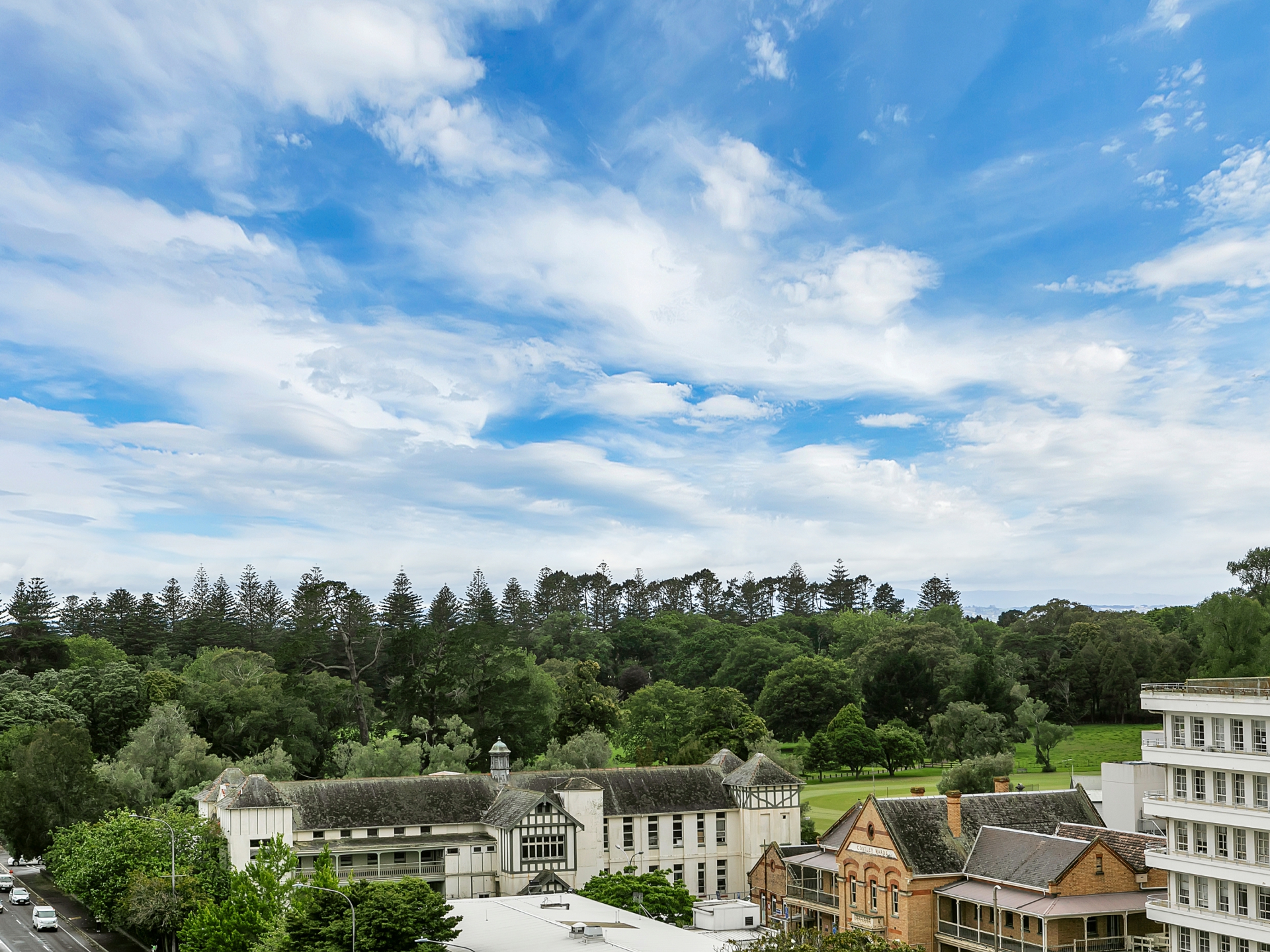Perched just one floor from the top of a modern complex, you gaze out over Cornwall Park to boot.