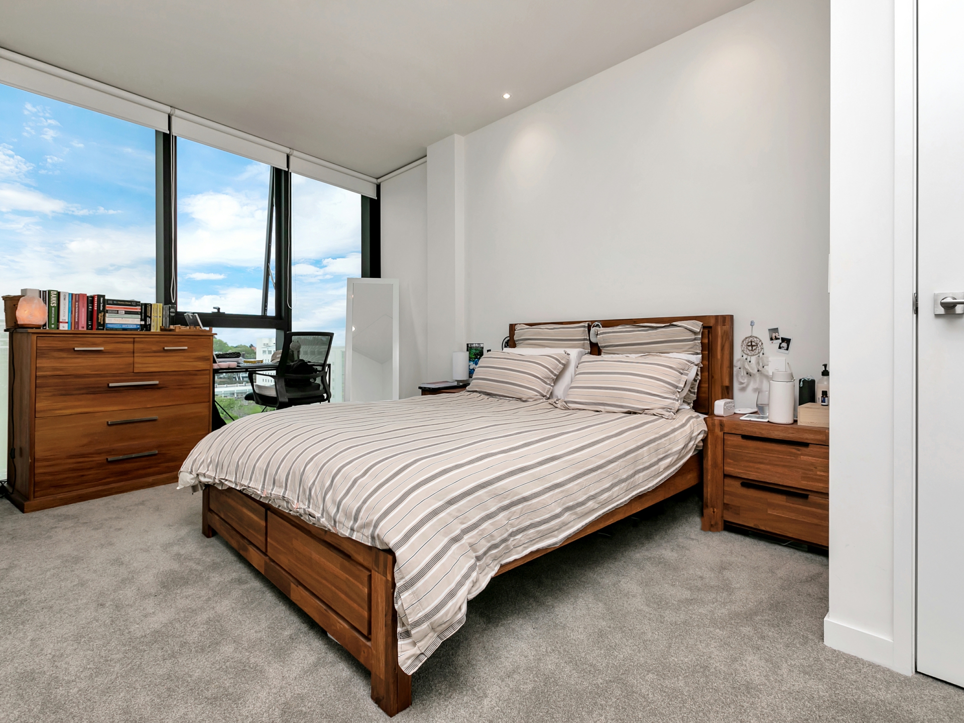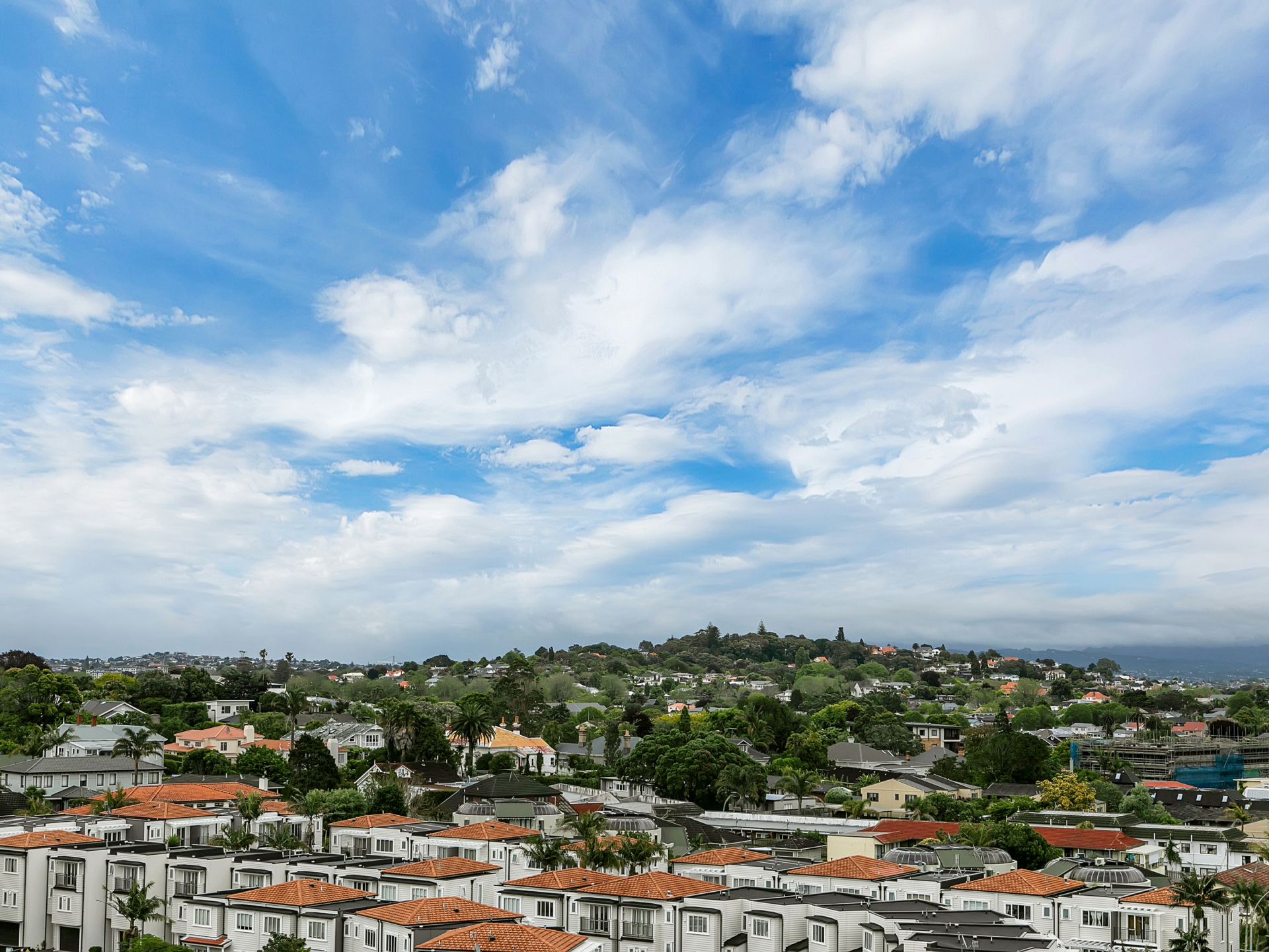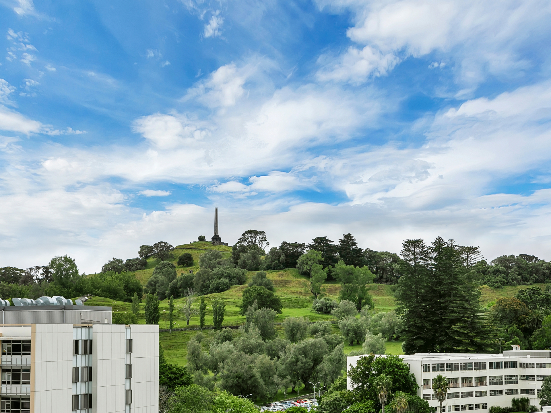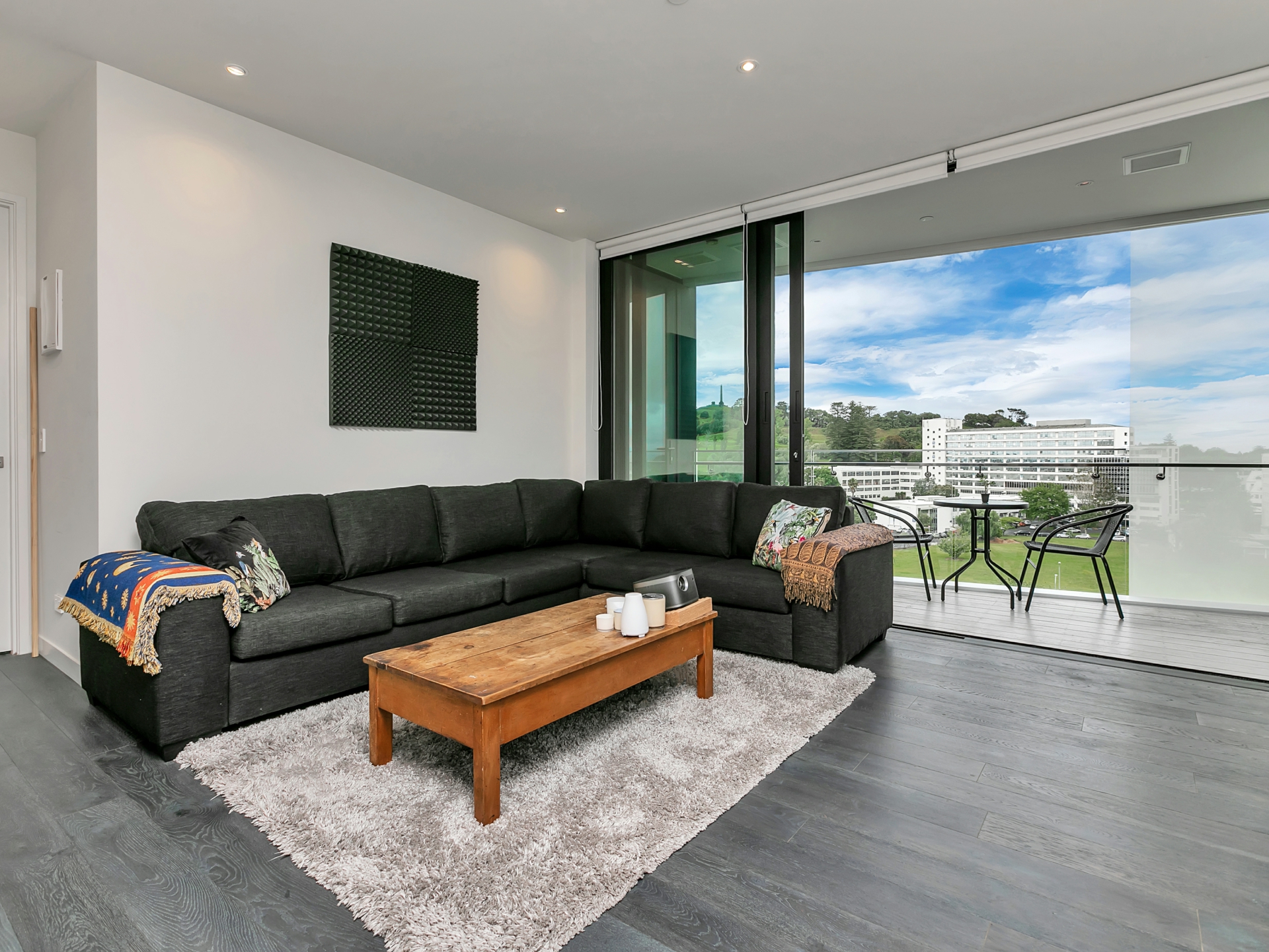 Perched just one floor from the top of a modern complex, you gaze out over Cornwall Park to boot.