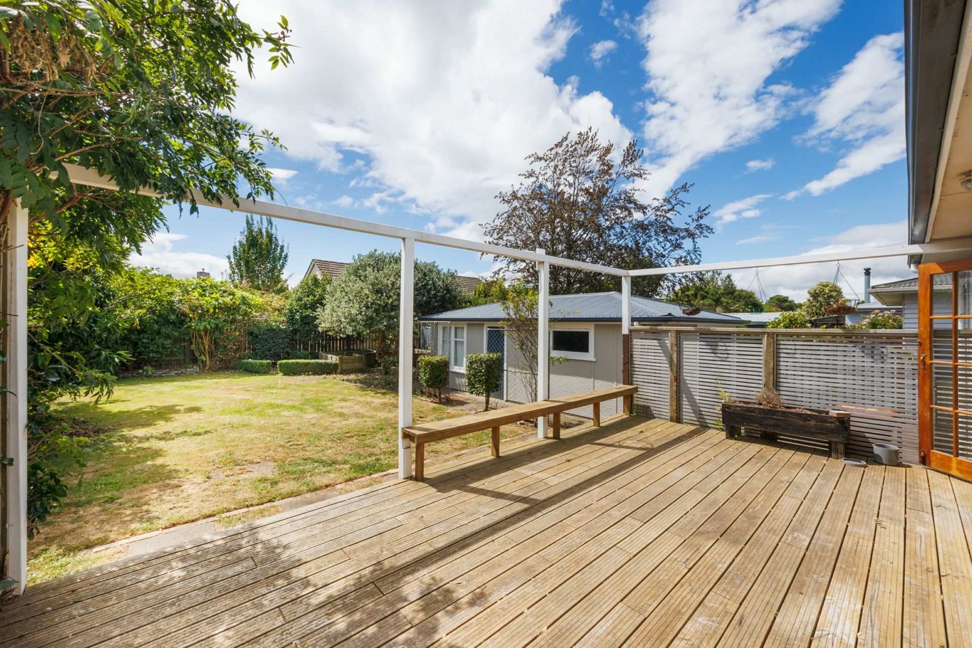 Set on a 617m2 (more or less) fully fenced section, the backyard is private with established trees and fruit trees, fully fenced, safe and secure for kids and pets.