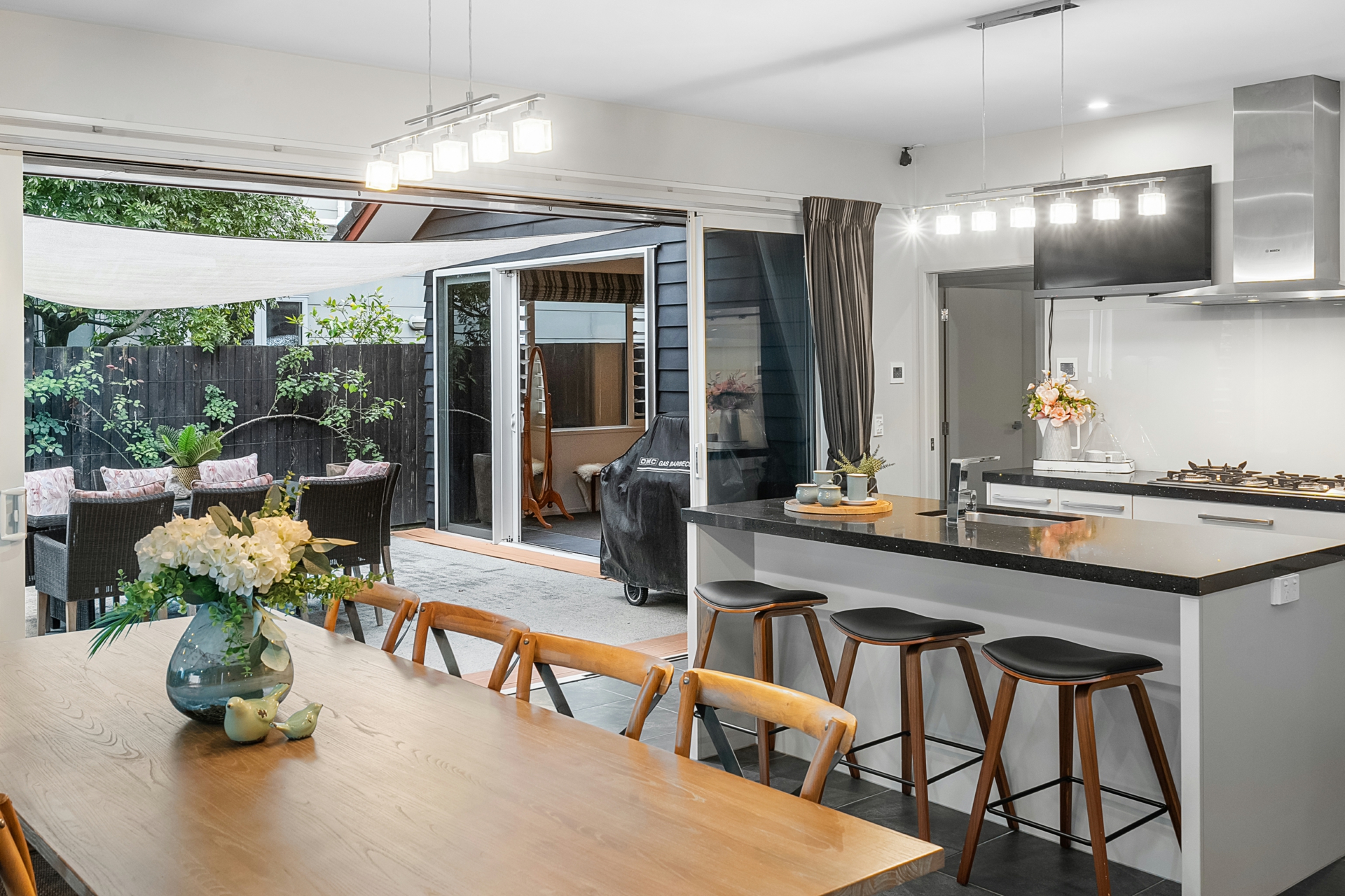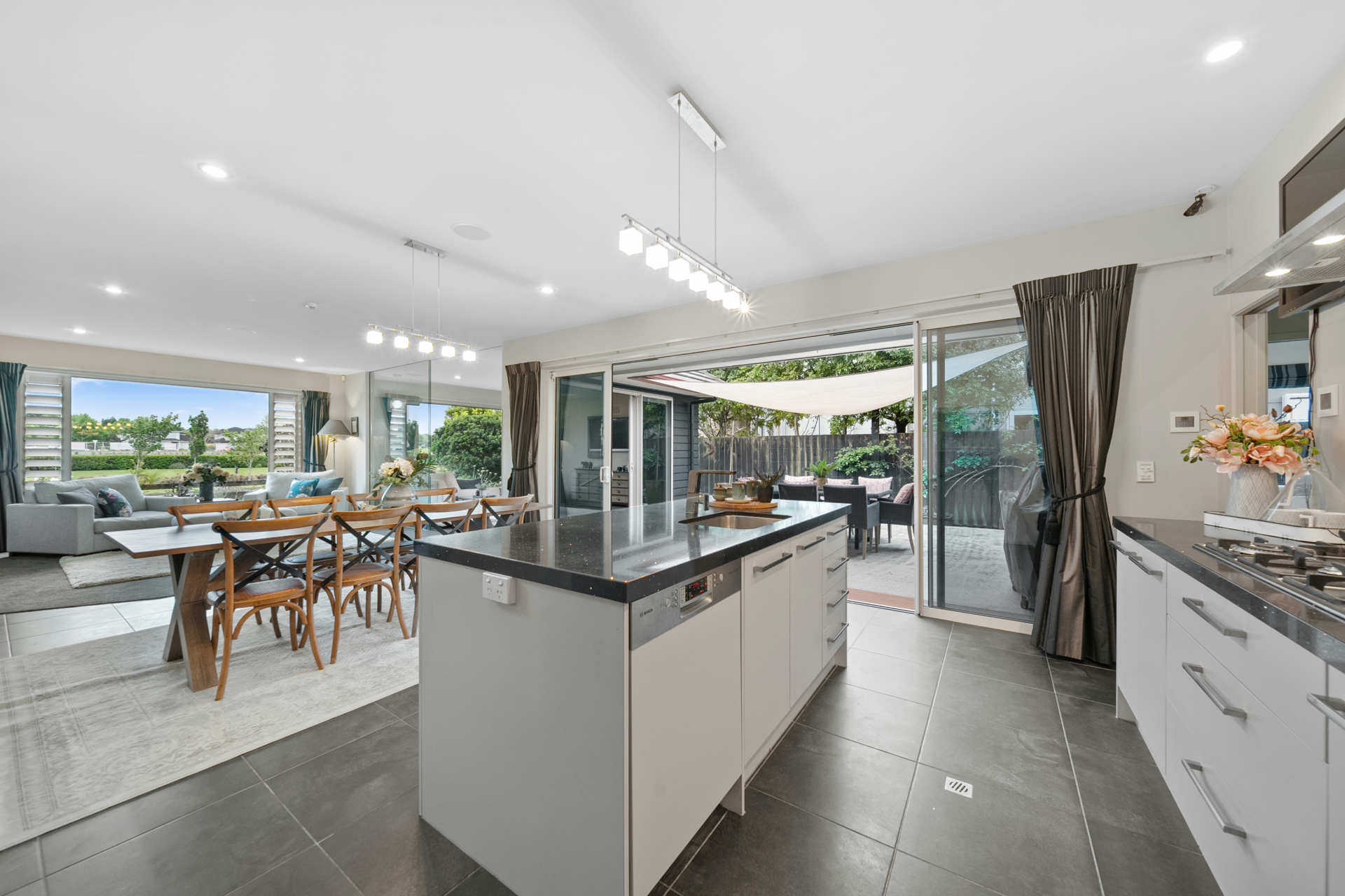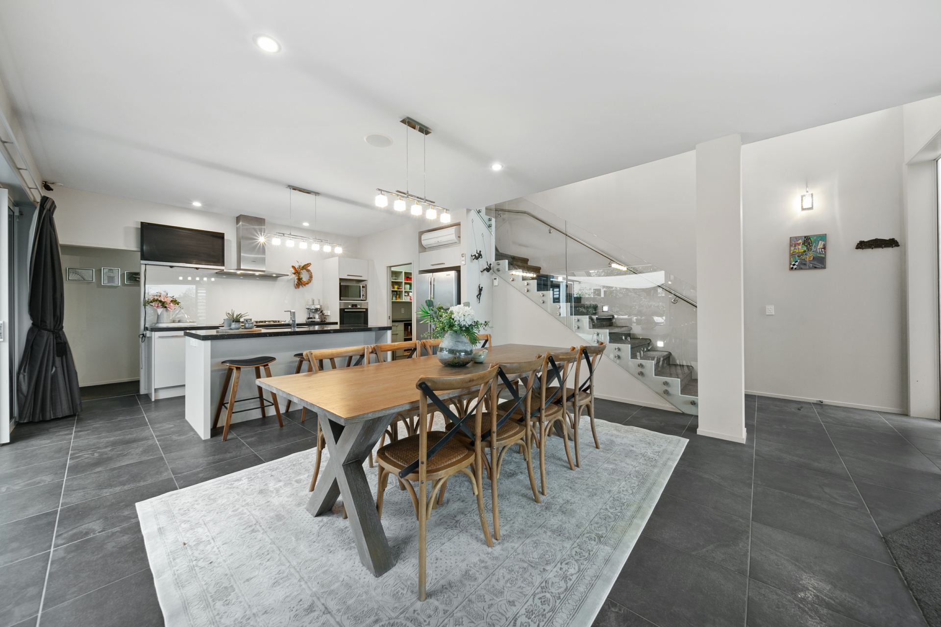 Inside, generous living spaces capture natural light and movement throughout the day. The open plan kitchen features stone benchtops, a full scullery and a natural flow to dining and lounge areas that extend seamlessly to sheltered outdoor living. A glass-walled retreat adds flexibility - ideal for quiet reading or evening conversation without closing off the space.