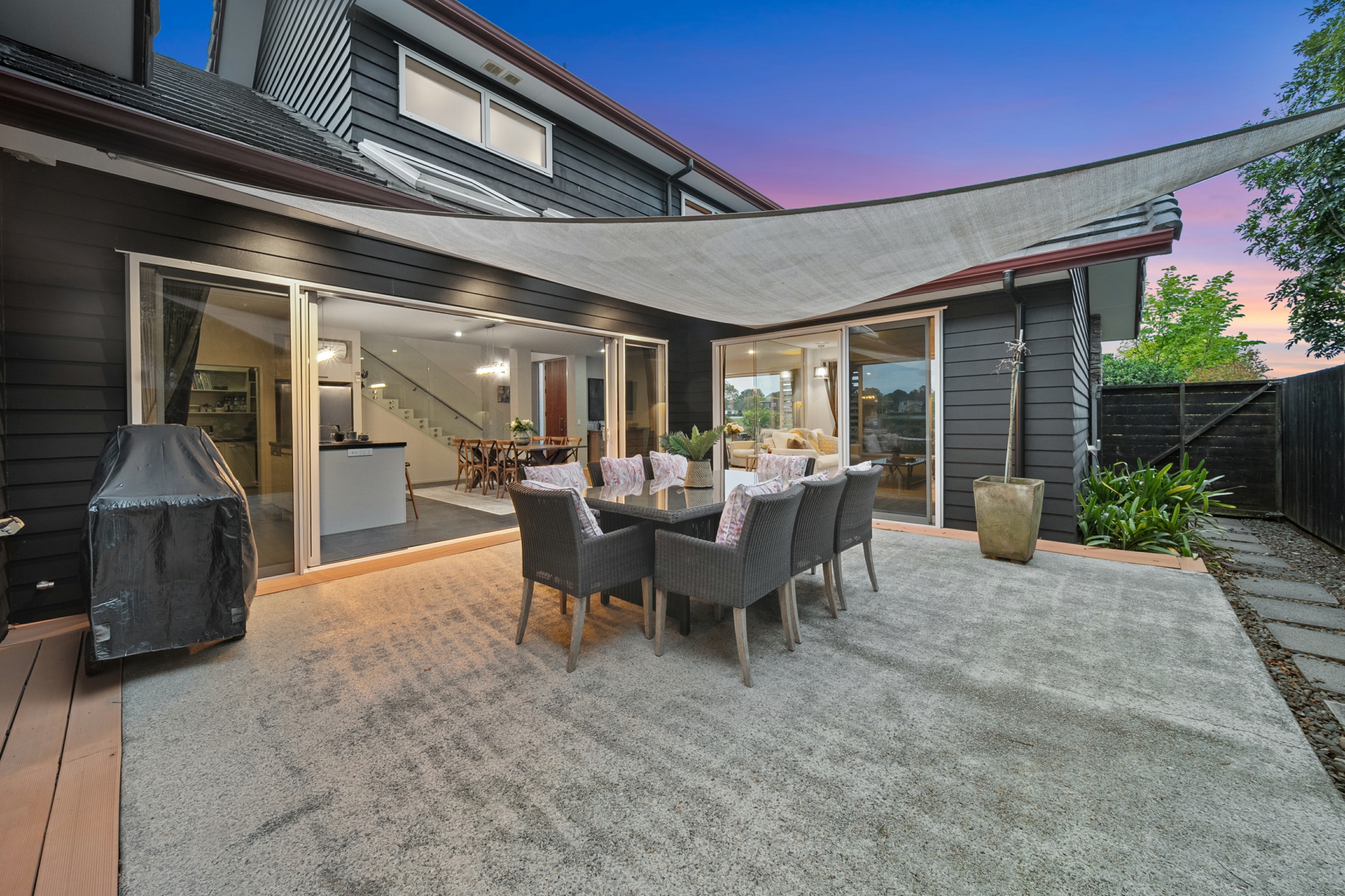 From the moment you arrive, the home feels grounded yet graceful. The hand-laid schist exterior anchors it to the landscape, while wide picture windows frame a living view of shimmering water, drifting geese and goslings, and the ever-changing Karaka sky.