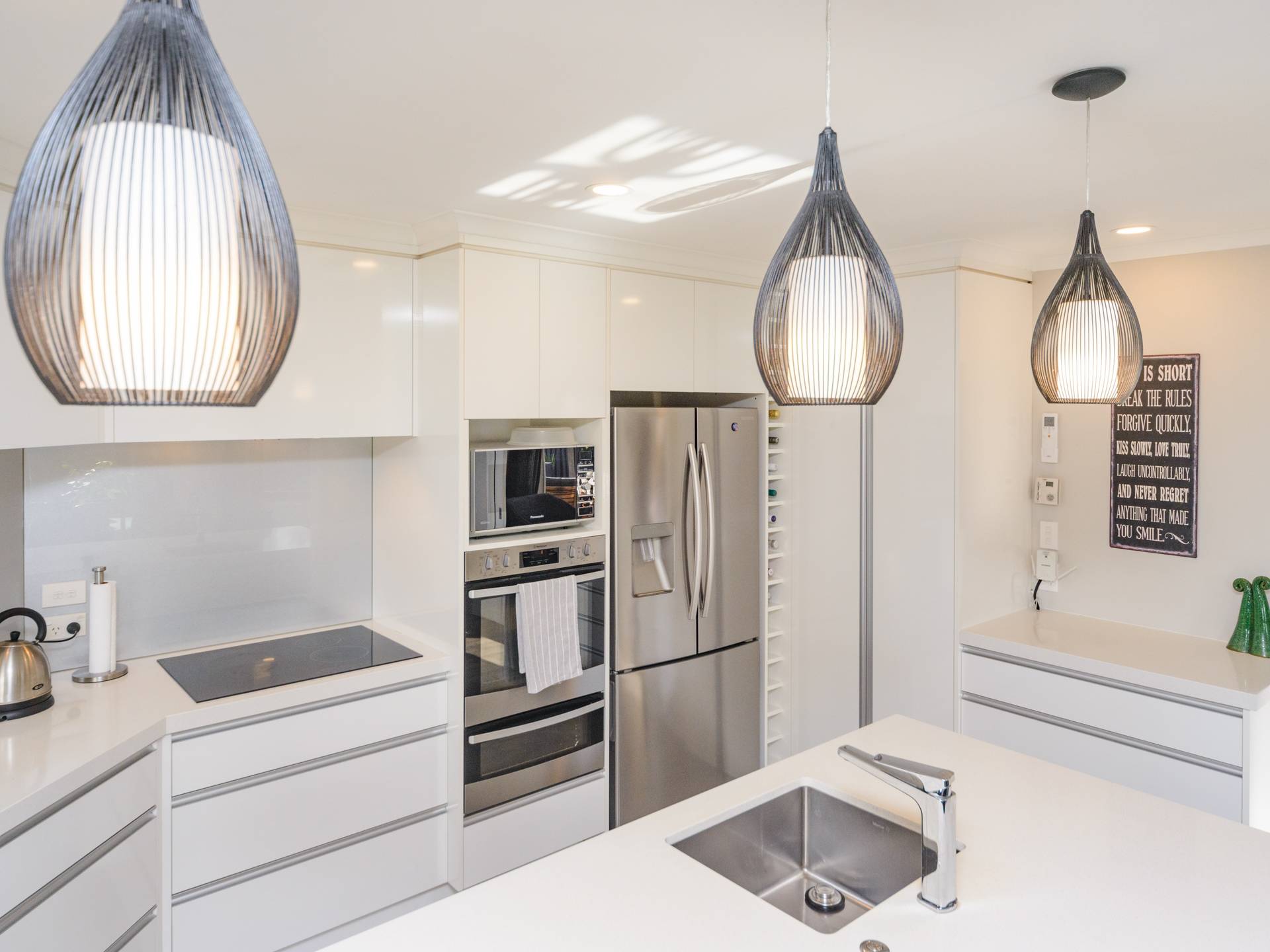Modern fresh kitchen with quality appliances, large middle island and plenty of storage.