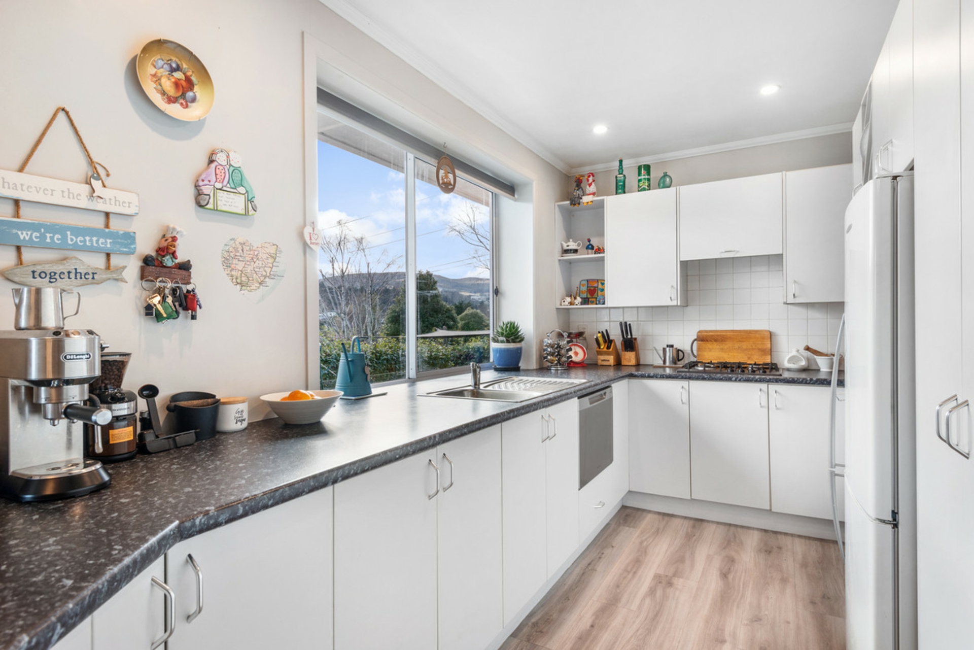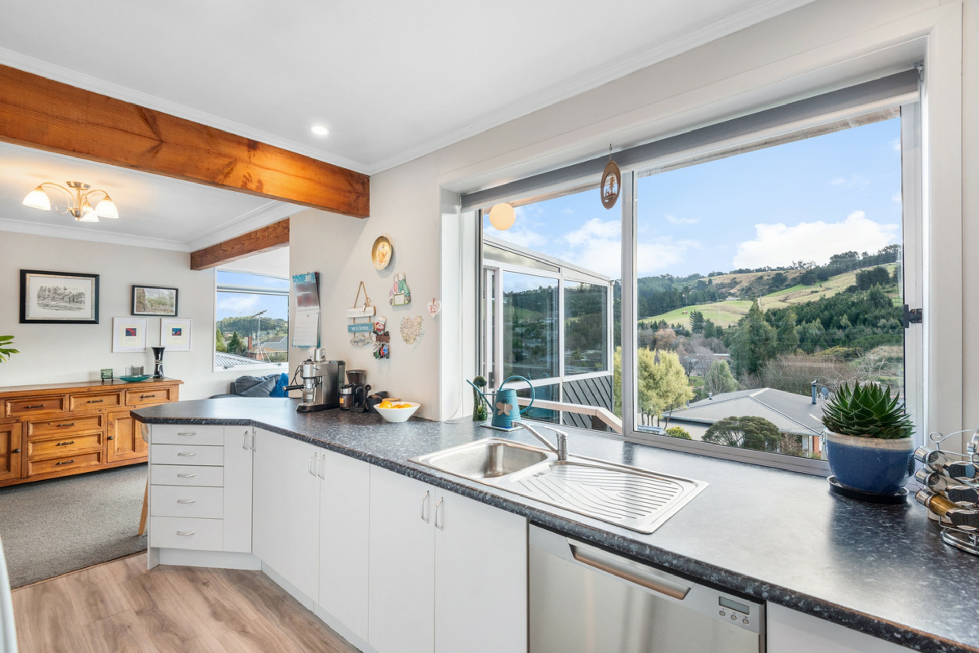 Inside, the open-plan living area is light and welcoming, flowing easily into an updated kitchen that's both functional and modern. From here, and from multiple spots throughout the home, you'll enjoy beautiful semi-rural views that bring a real sense of space and serenity to everyday living. A sunroom off the kitchen adds a cozy nook for morning coffees or a quiet moment in the afternoon sun, all while soaking in the peaceful outlook.