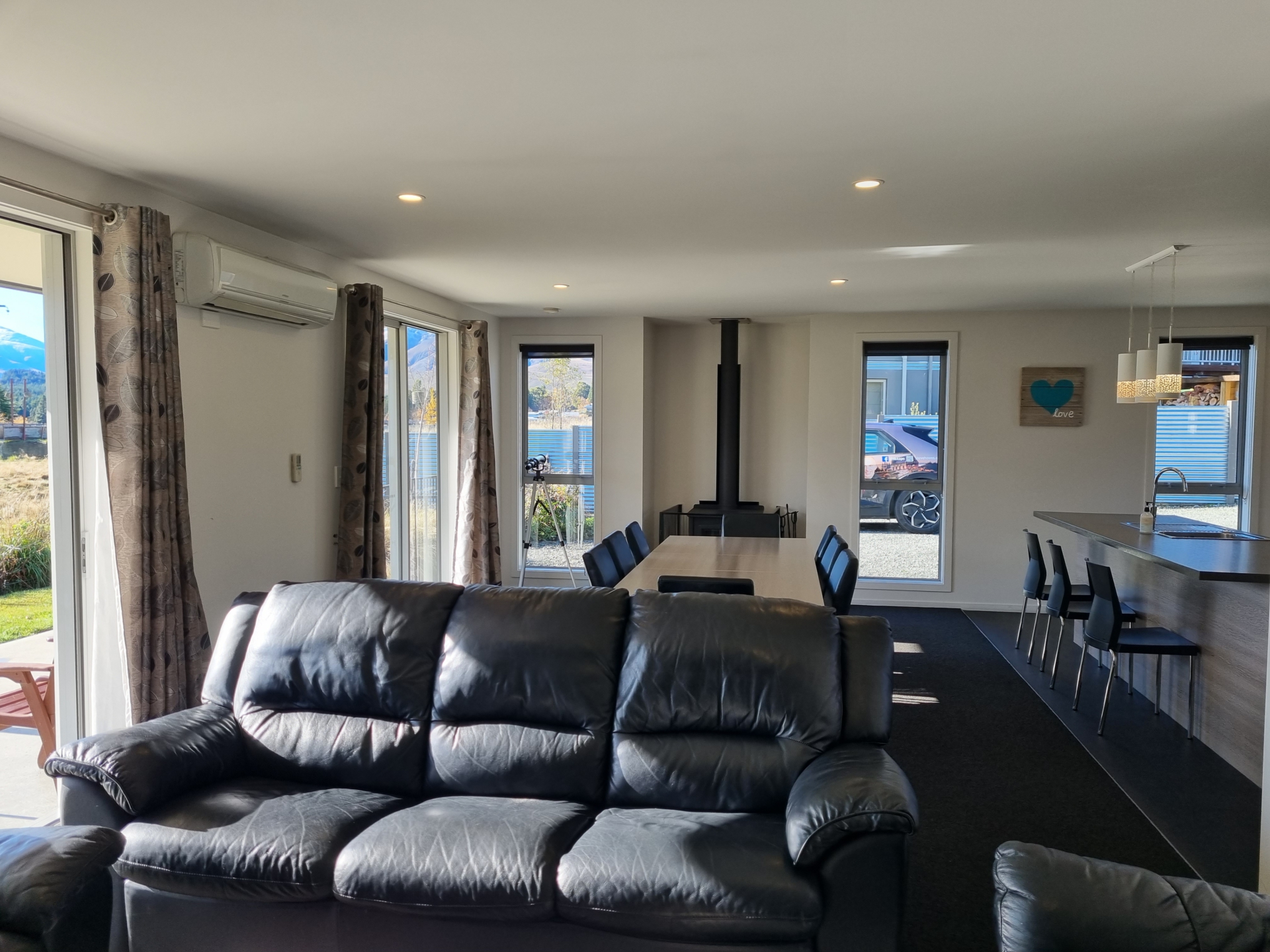With a modern kitchen, spacious dining & lounge areas all enjoying the northern views & all-day sun and featuring both a log burner & a heat pump for warmth in the cooler months, the open plan living area is inviting. A further heat pump in the hall ensures the remainder of the home is kept equally as cosy.