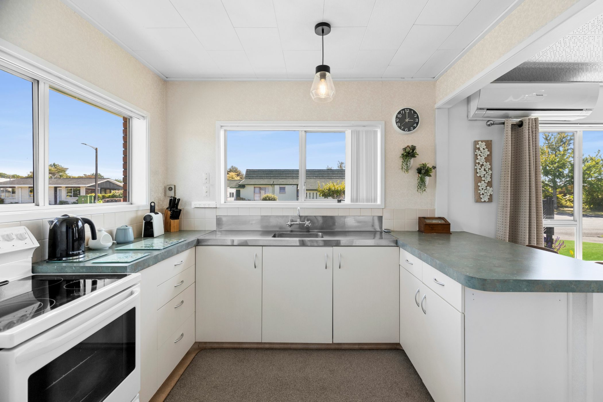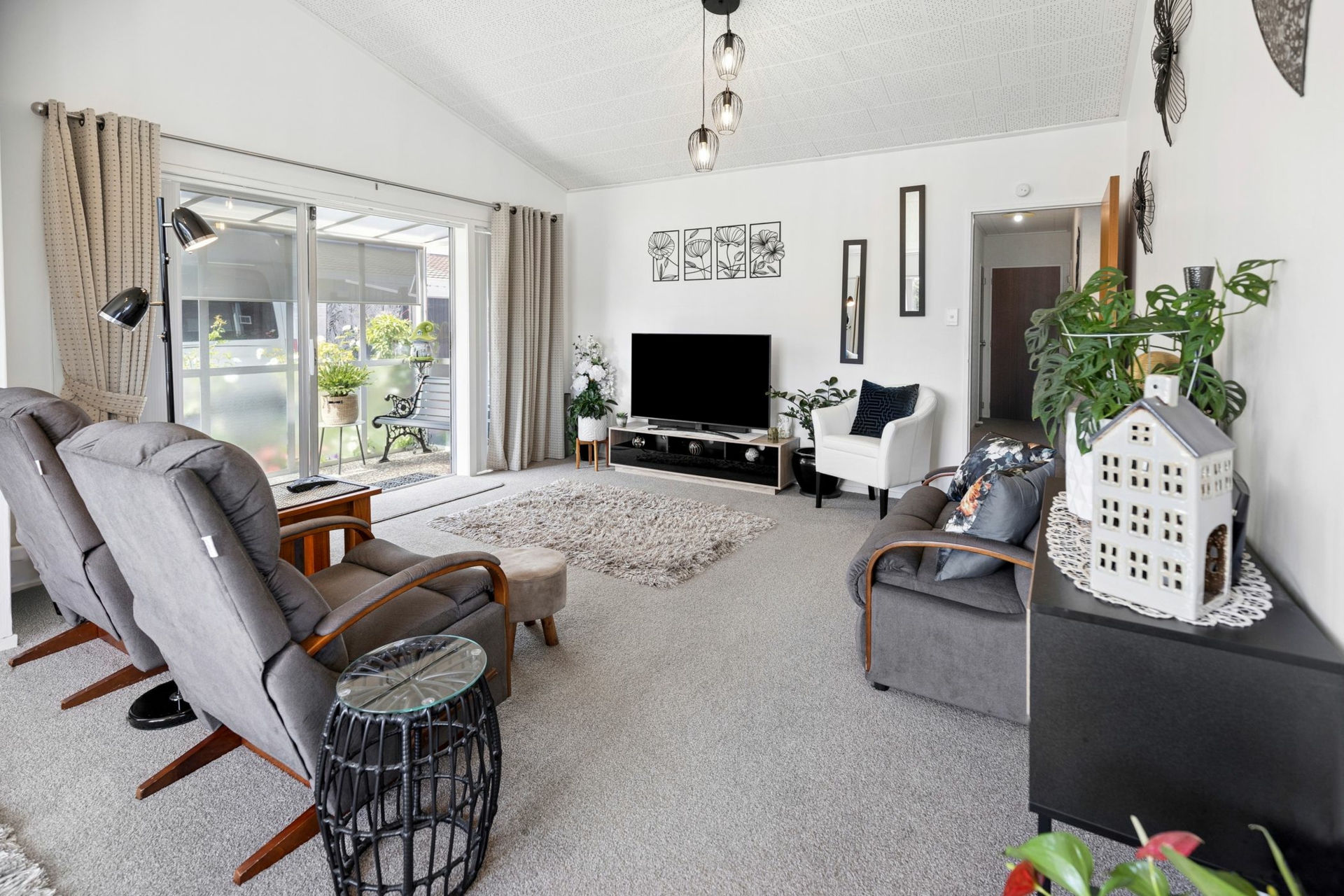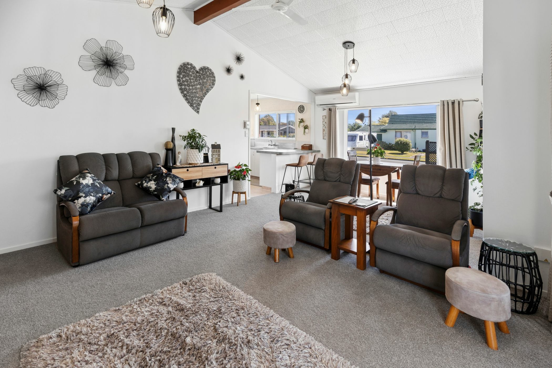 Designed for ease of living, the home features a ramp entrance leading into a charming sun porch, which flows seamlessly into a spacious, light-filled open-plan living area. With vaulted ceilings, fresh paint, brand-new carpet, ceiling fan, blinds and stylish drapes, this inviting space is both modern and comfortable. A heat pump ensures year-round comfort - keeping you cosy in winter and cool in summer.