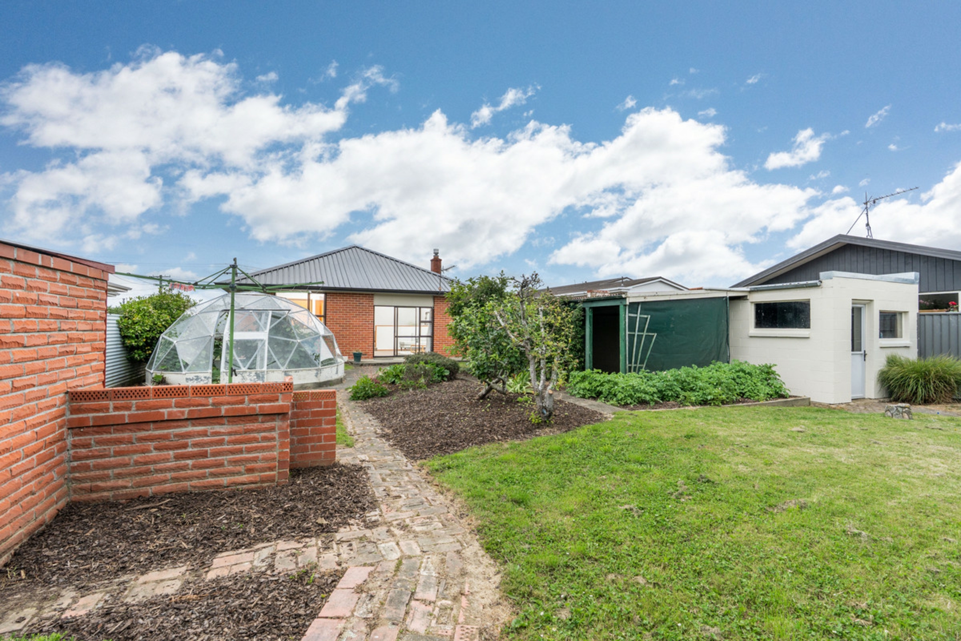 Outdoors, the large back section provides plenty of room for gardens, children, and pets. A spacious glasshouse, two garden sheds, and established fruit trees, including productive grapes, enhance the appeal.