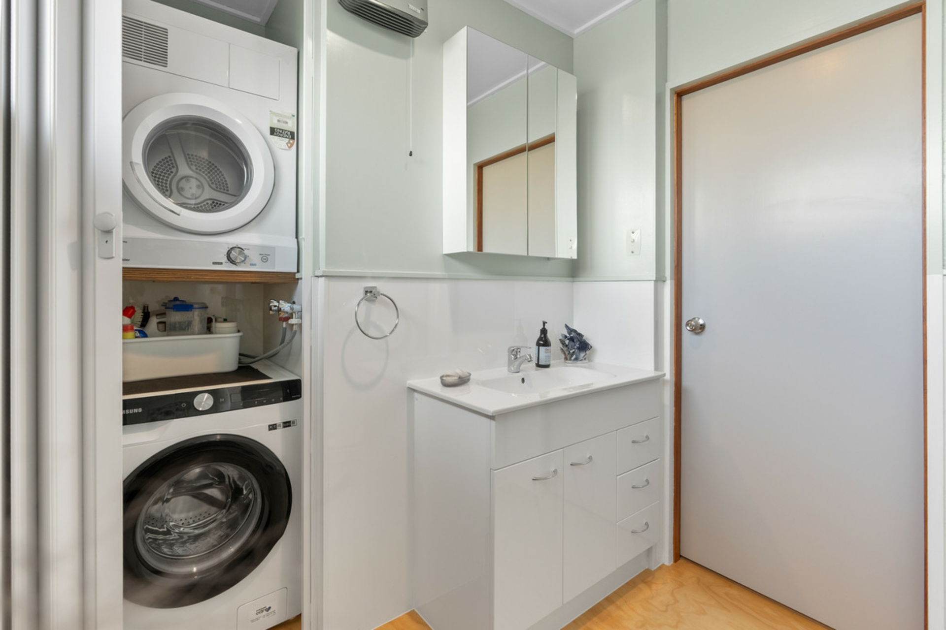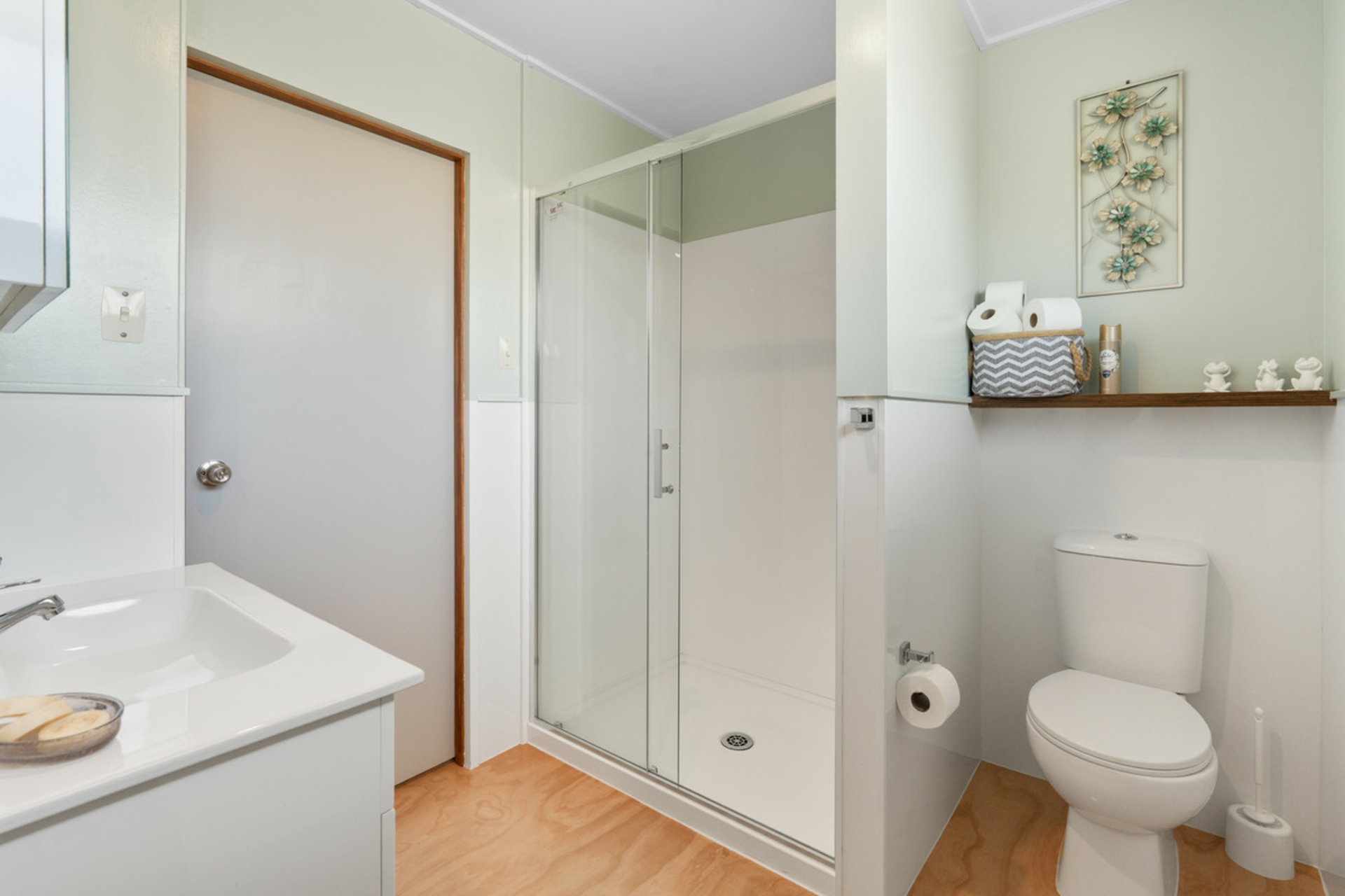 The bathroom is practical and tidy, featuring a shower, toilet, and a cleverly hidden laundry for added convenience.