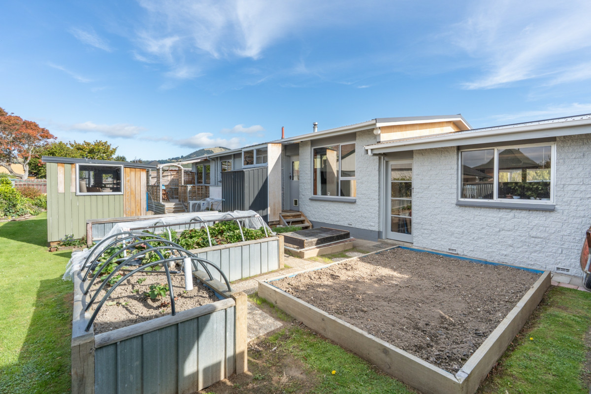 Heading out the back door, you'll find a sunny deck area, complete with a handmade blind and mat creating shelter, a great space to enjoy in all seasons. The section is semi low maintenance, with gardens, vegetable plots, and raised garden beds for those who enjoy a bit of homegrown produce.