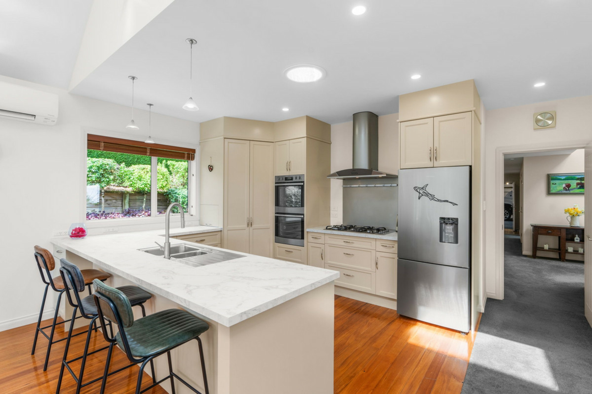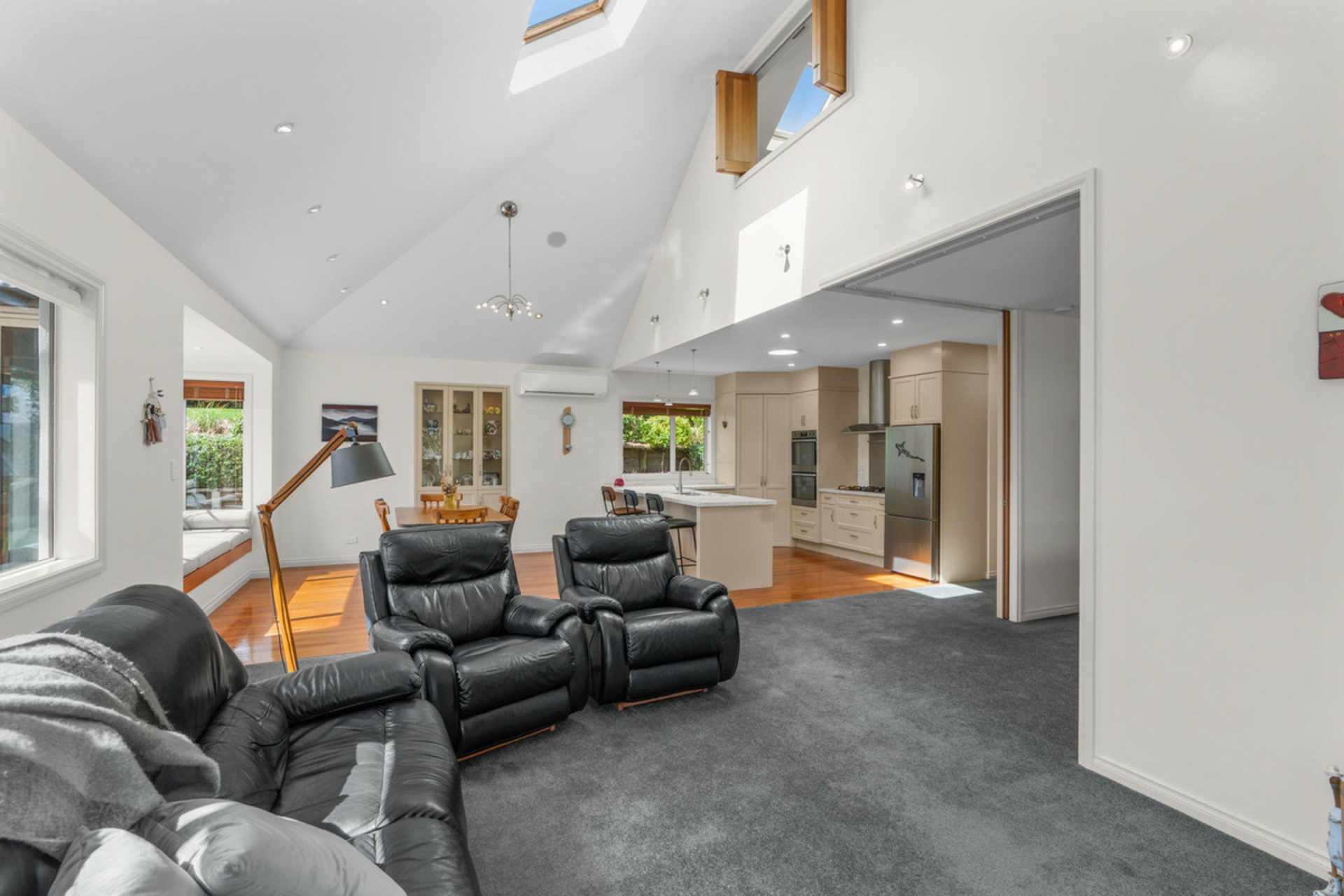 The large kitchen sits at the heart of the home, offering ample storage and bench space, ideal for those who love to cook and entertain. Open plan living flows effortlessly through the dining, lounge, and second living area, which can be separated by large doors for privacy when needed. A cosy window seat makes the perfect spot to relax with a book, while warmth is well catered for with both a woodfire and heat pump.