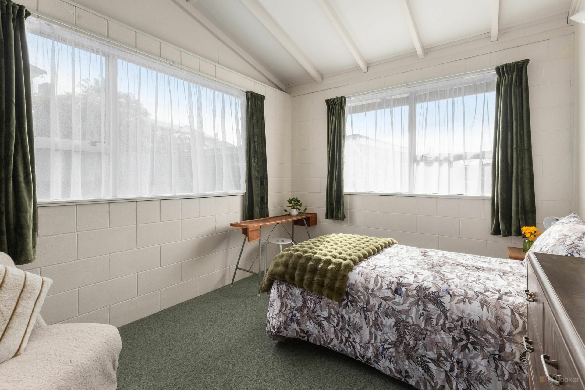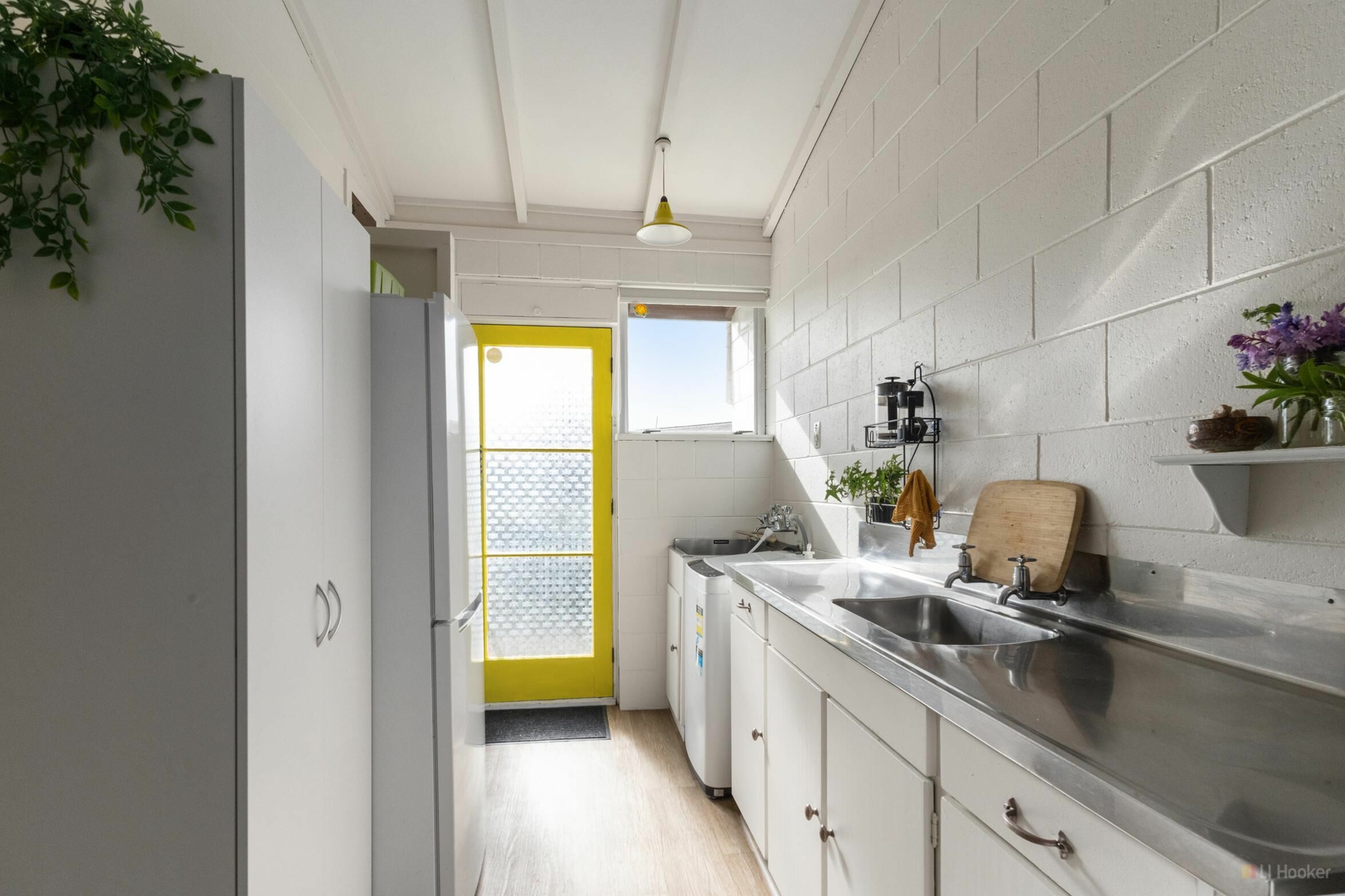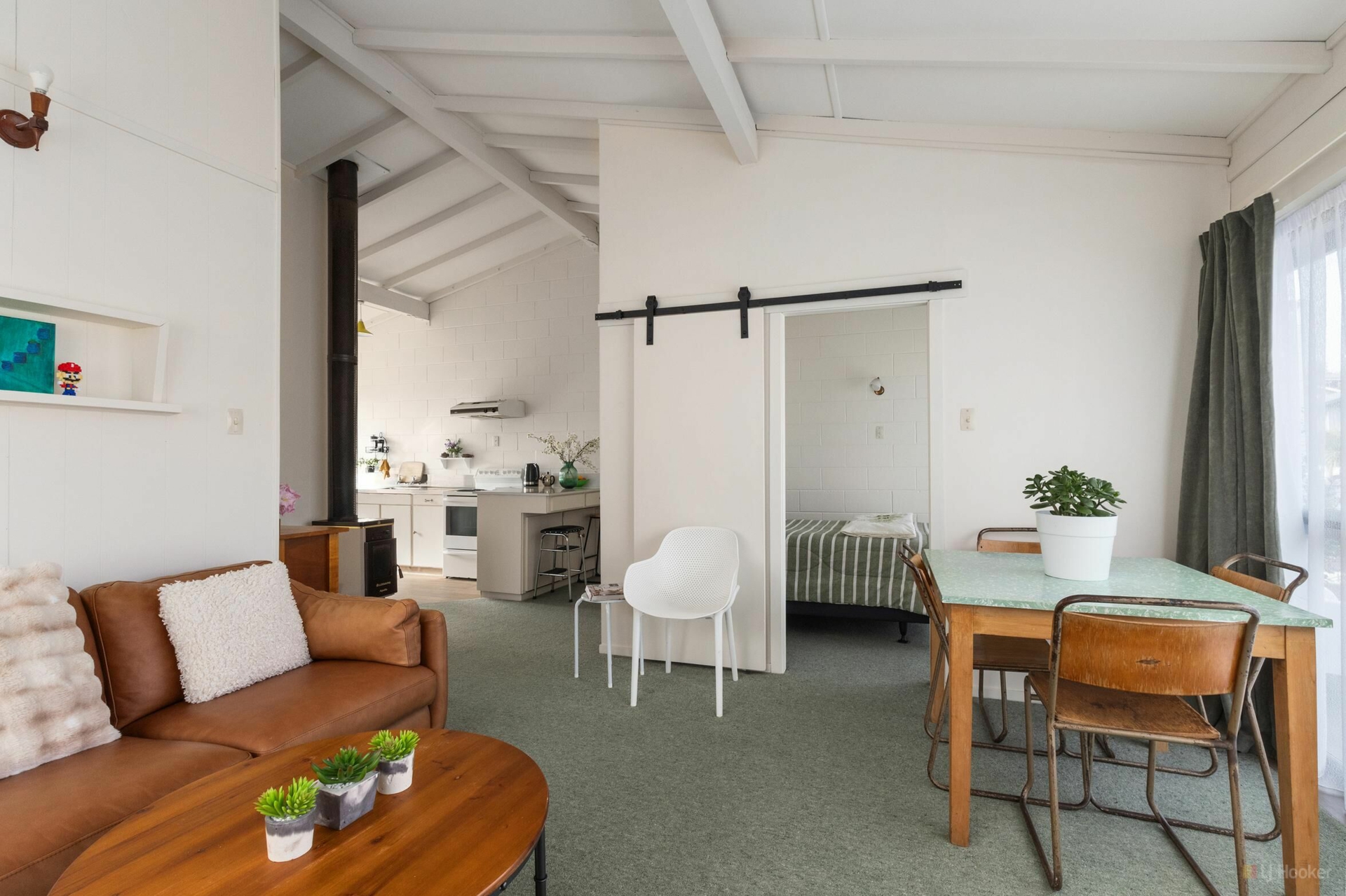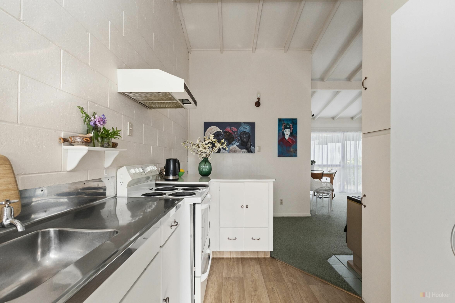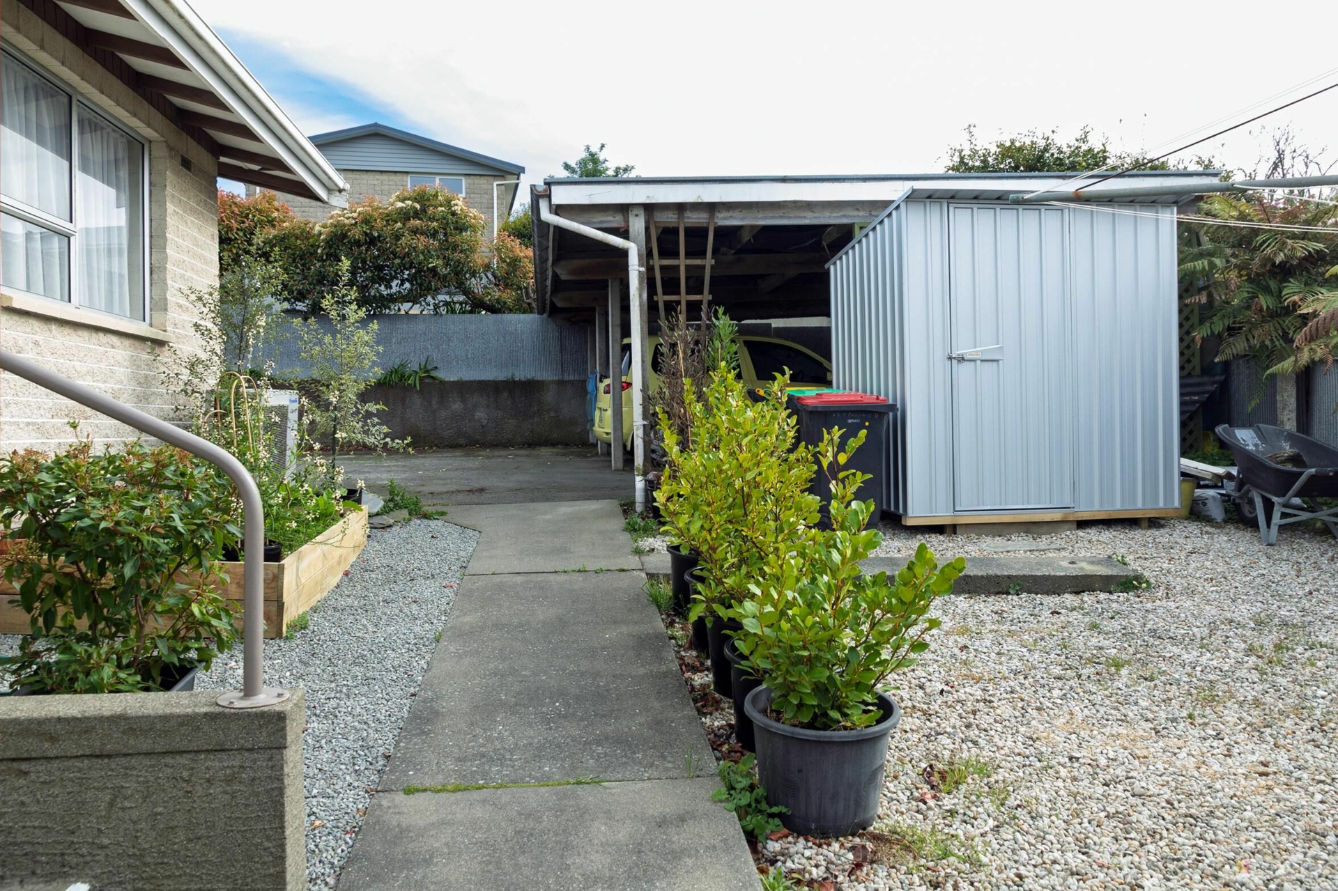 A very cool, very retro vibe with great attention to detail. It's fun stepping inside - not at all what you'd expect from the outside. No lawns to maintain, just a small seating area, garden shed, and carport.