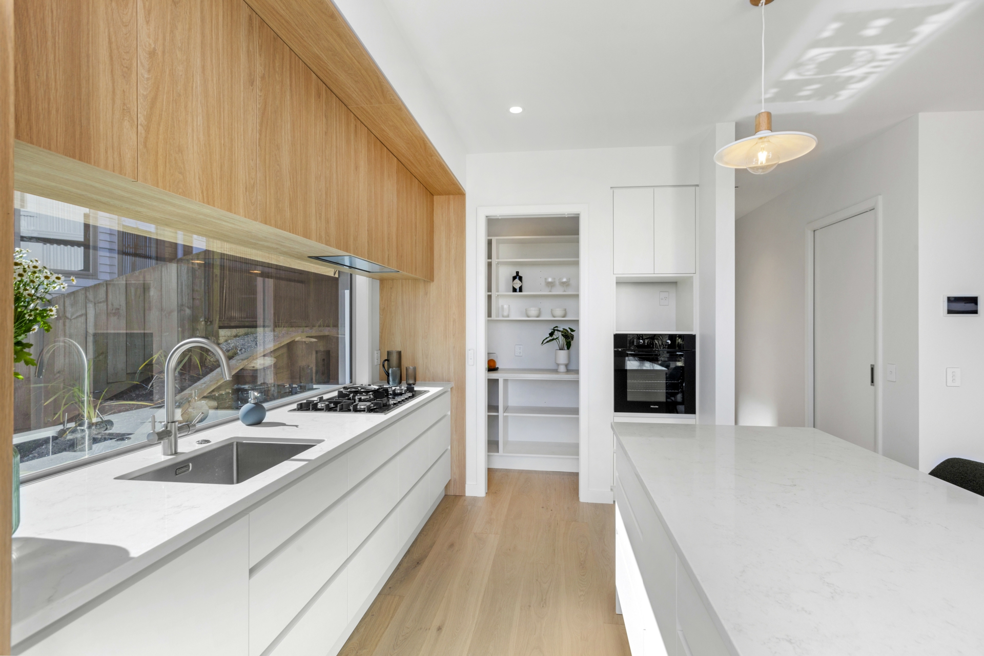 At the core of this exquisite home lies a functional and stylish kitchen. Boasting ample storage, a walk-in pantry, Miele appliances, and stone countertops, this space is designed for culinary delight. Enjoy the seamless flow to two stunning living areas, each with easy access to outdoor spaces.
