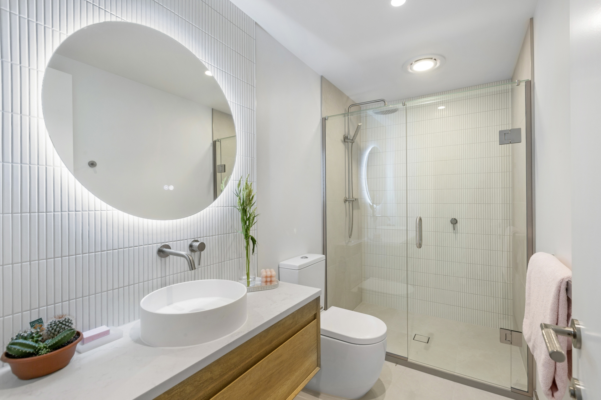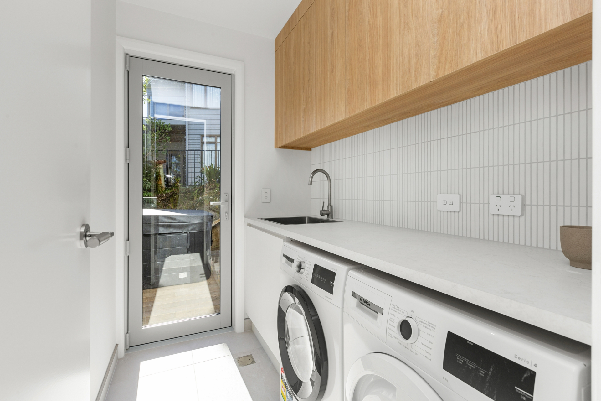 The lower level features two generous bedrooms, each with built-in wardrobes, sharing a beautifully appointed family bathroom. A separate laundry room and a single garage with internal access add to the convenience and functionality of this exceptional home.