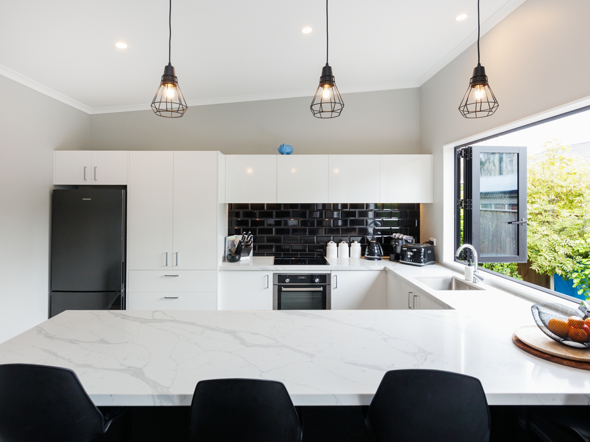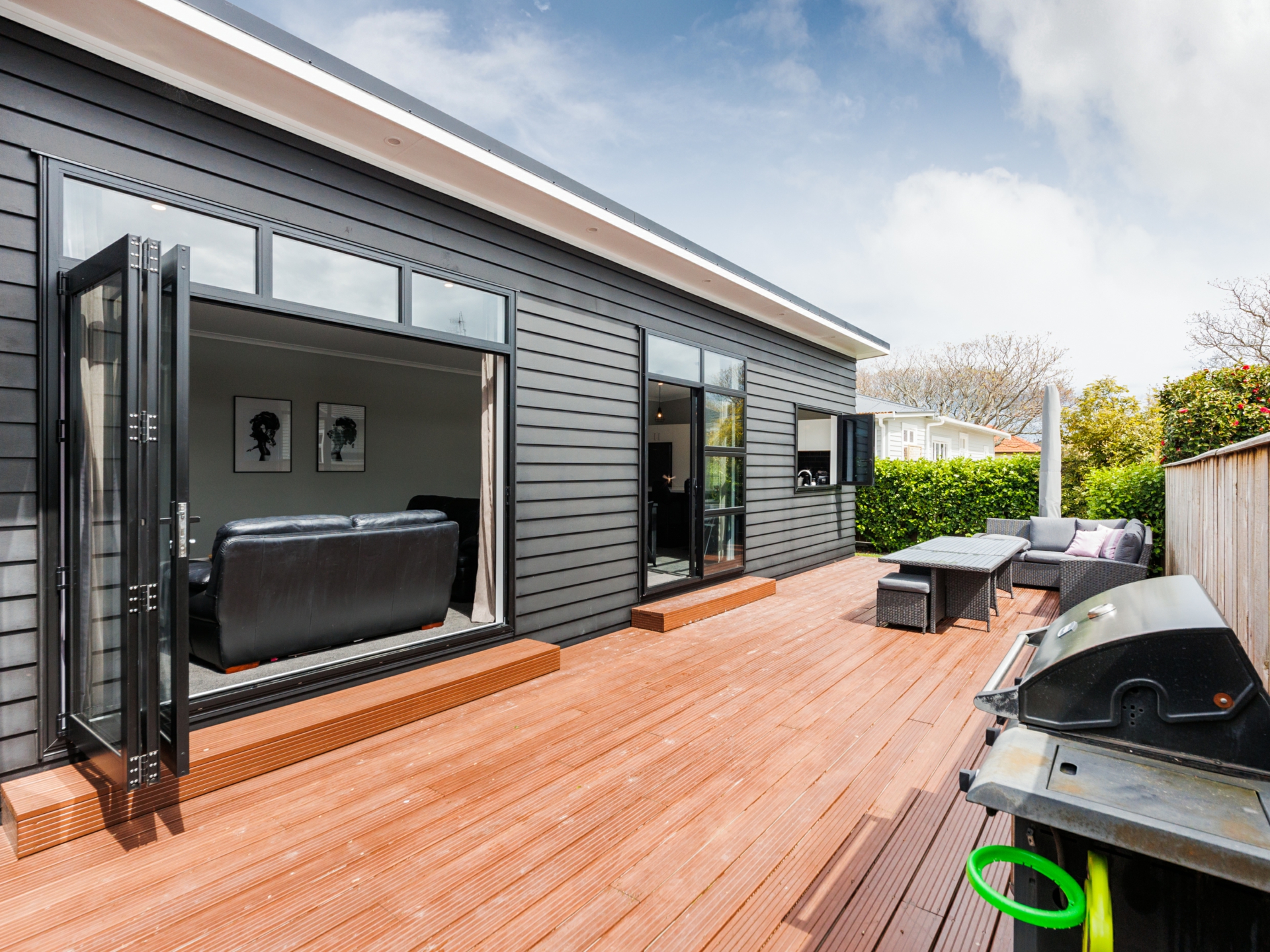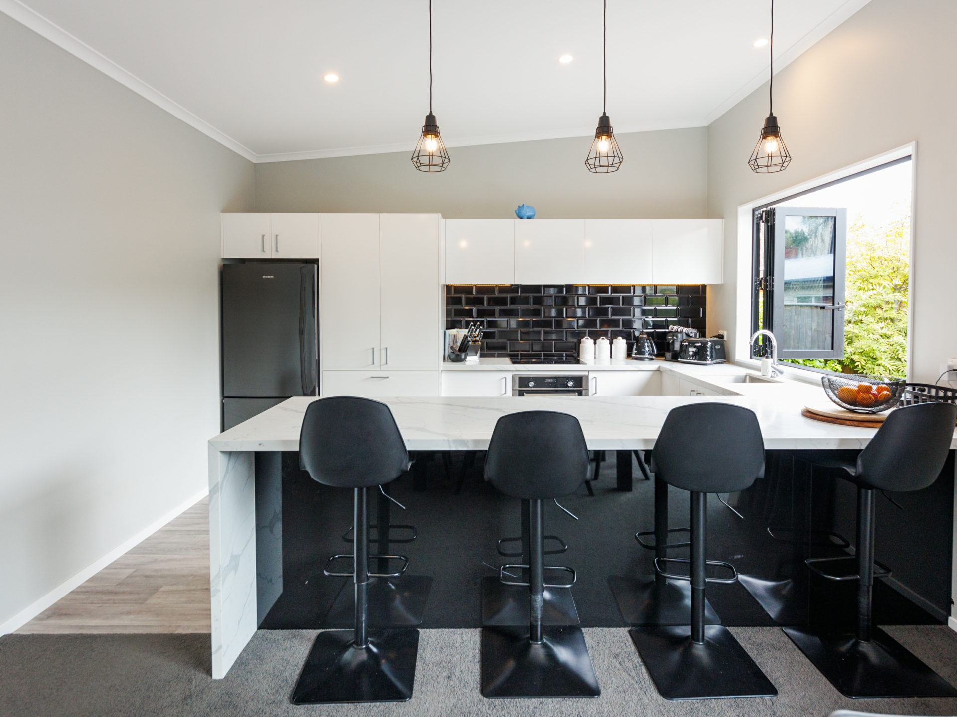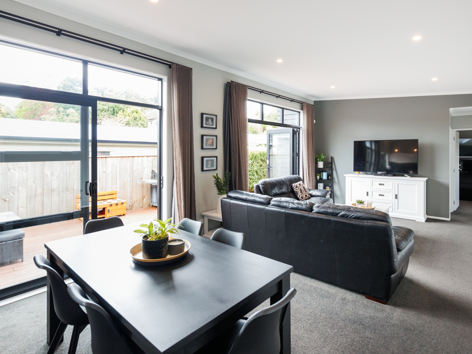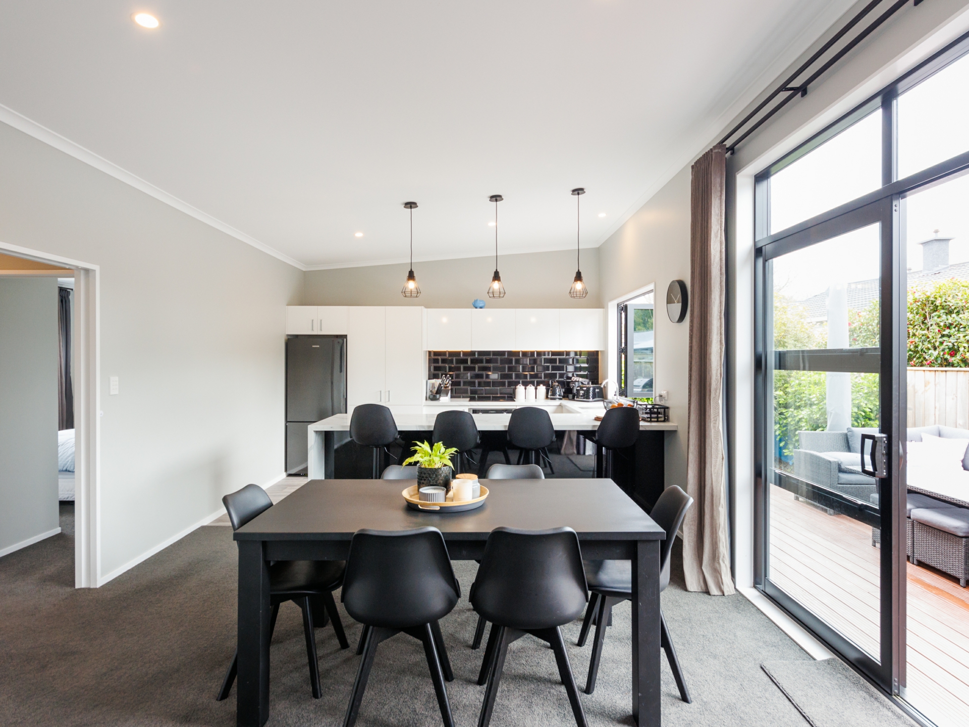 Beautifully designed modern kitchen offers high quality appliances, ample bench space & stunning black subway tile splashback. Bi-folding window opens out to the deck so you can socialise with your guests. Open plan dining & living equipped with heatpump. Bi-folding doors flowing out to the sunny deck. A perfect place for entertainment.