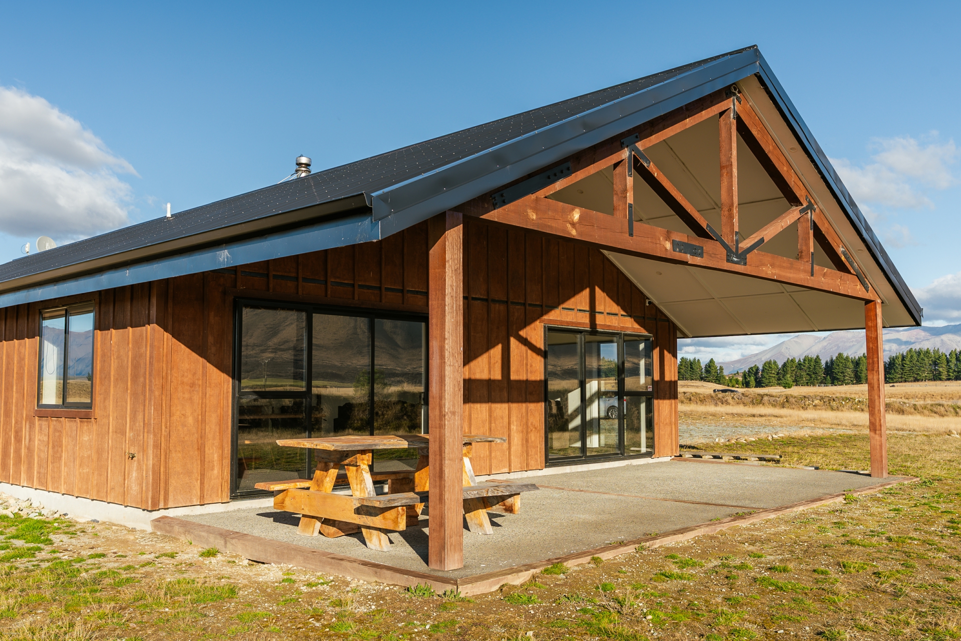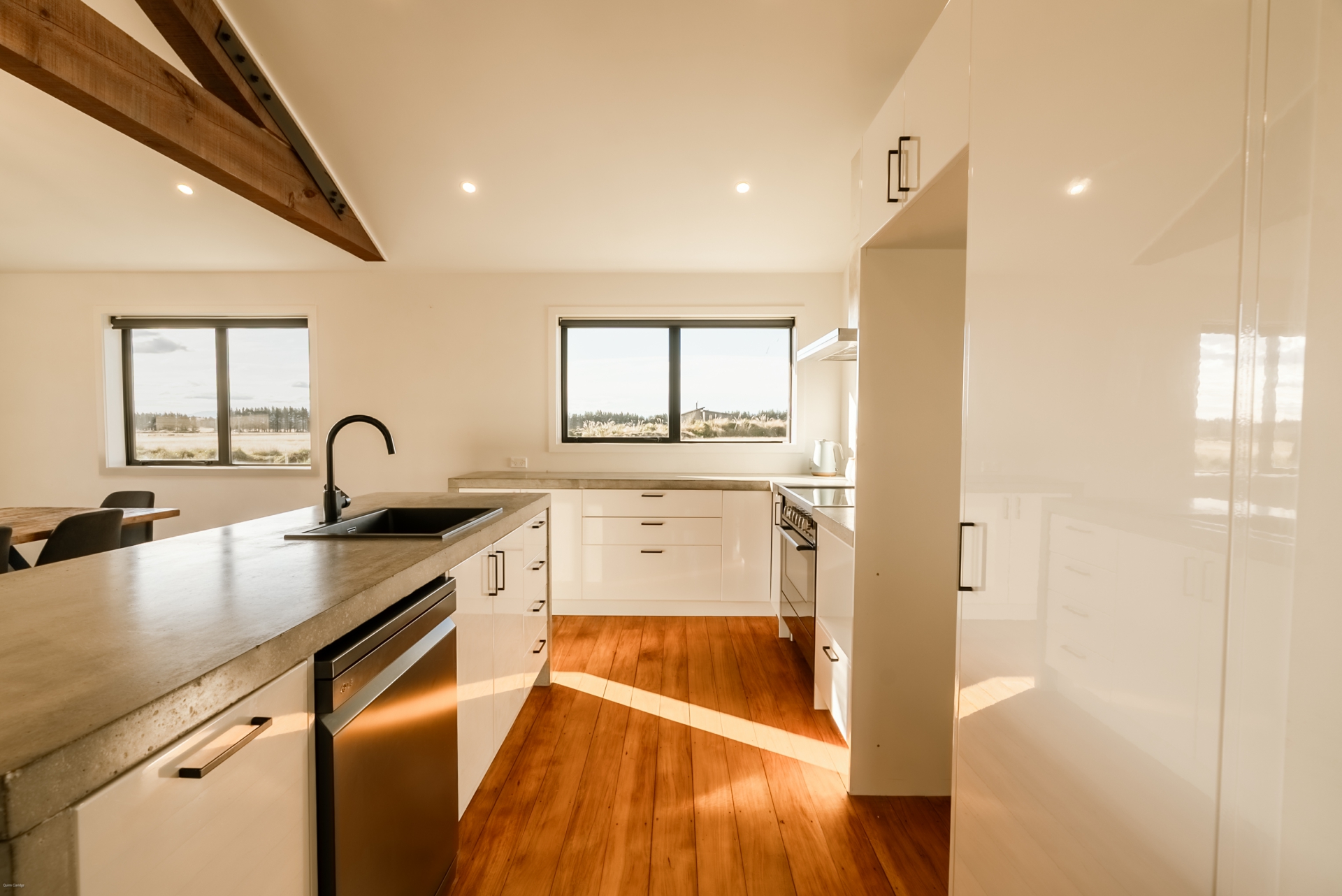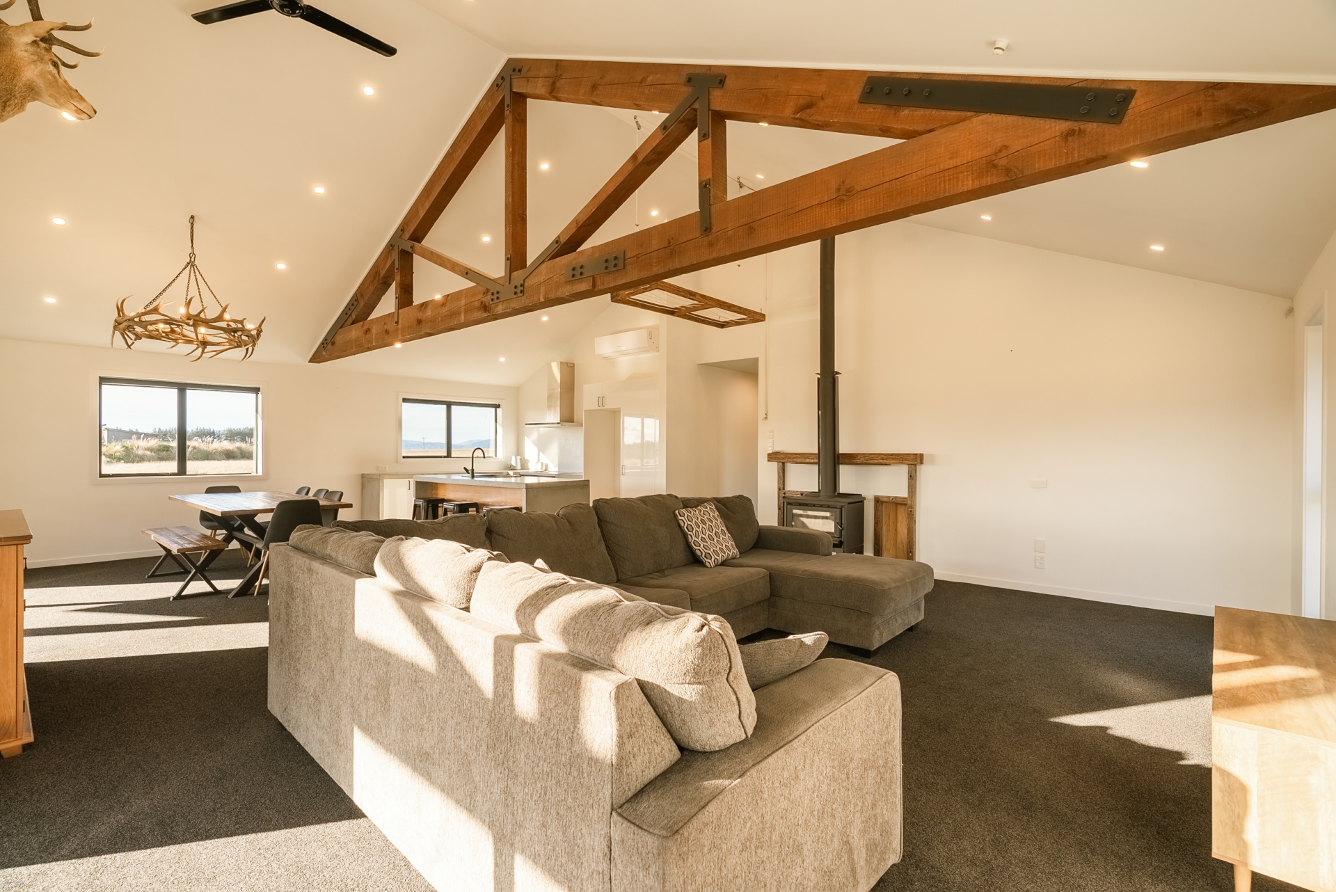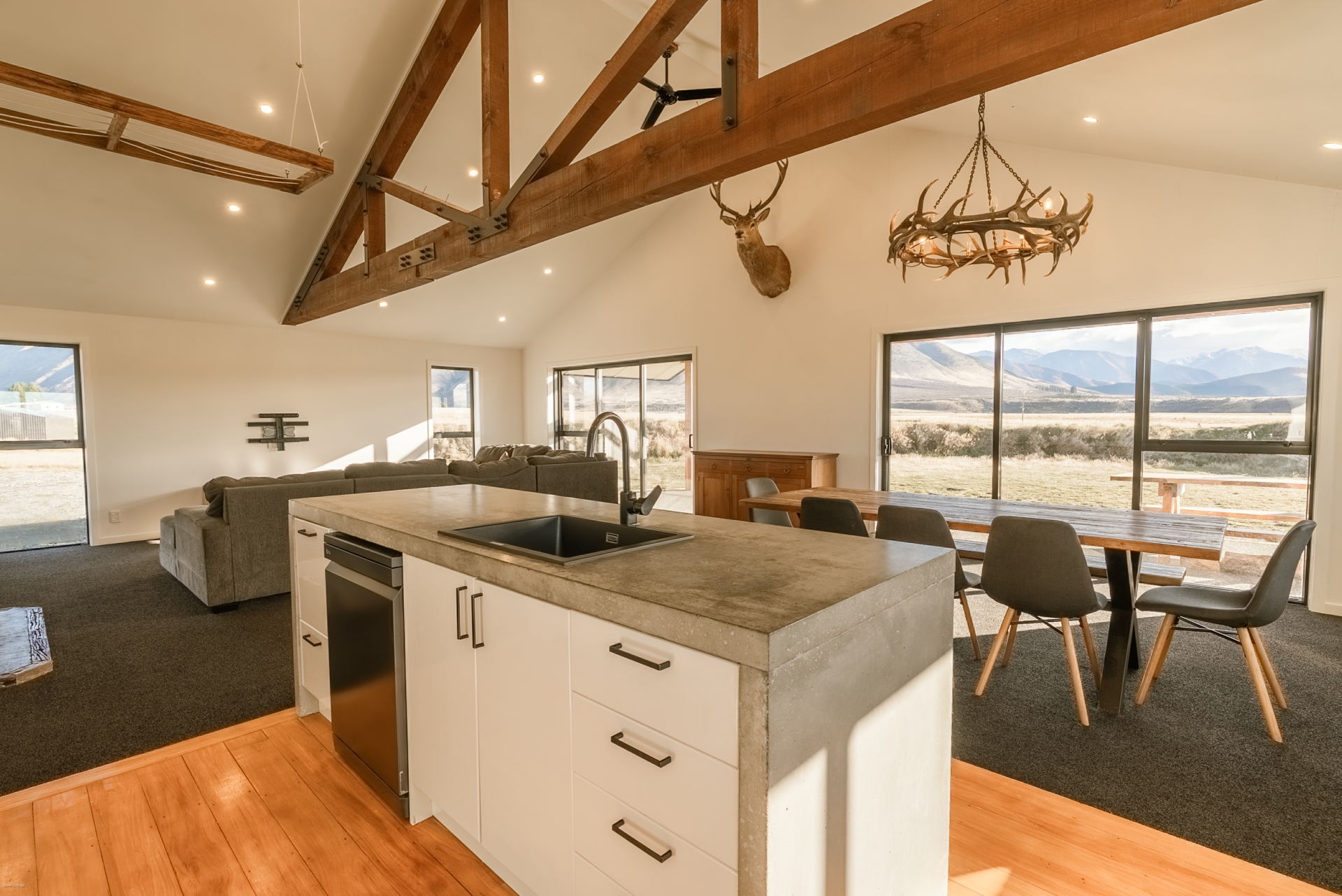 The home features a spacious open-plan living area with high ceilings and exposed beams, creating an airy, light-filled hub for daily life and entertaining. The modern kitchen is beautifully finished with concrete benchtops, adding a touch of industrial charm to the warm, natural aesthetic. Living spaces flow effortlessly to a covered concrete patio, perfect for outdoor dining or simply relaxing while soaking in the uninterrupted views of the surrounding mountains.