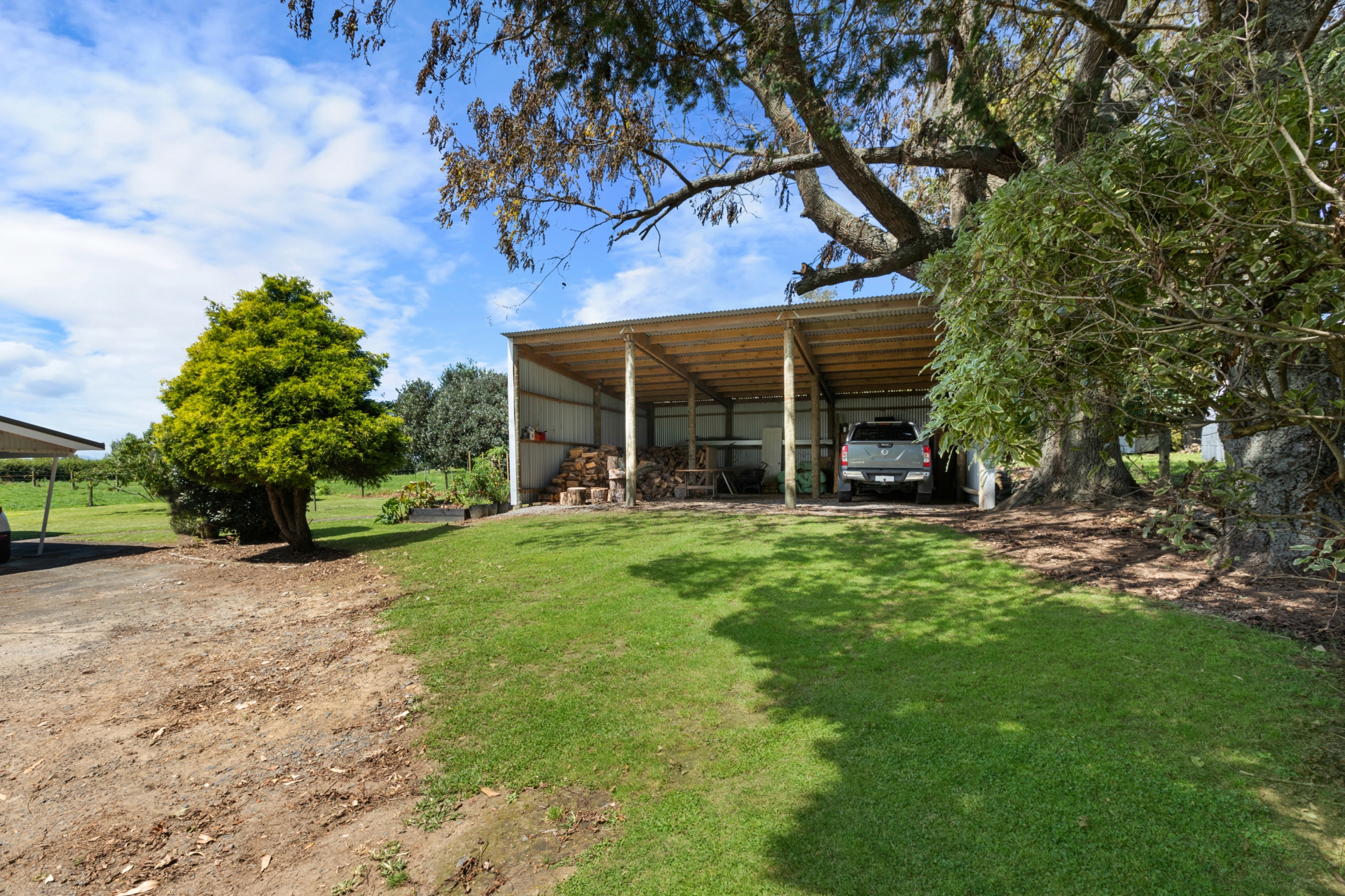 Carport and small garden shed add to the country flavor.